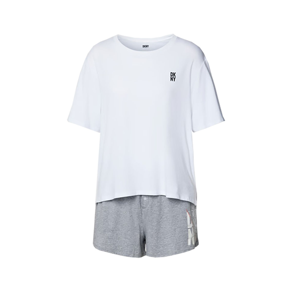 Піжама вільного крою, що складається з футболки із коротким рукавом та шорт. Виконана з гладкого та приємного трикотажу, який дарує шкірі незабутній комфорт. Футболка із заниженою лінією плечей та класичним круглим вирізом, прикрашена набивним малюнком у вигляді логотипу. Шорти з еластичною резинкою для зручнішої посадки, доповнені трьома гудзиками на передній панелі та бічними кишенями.