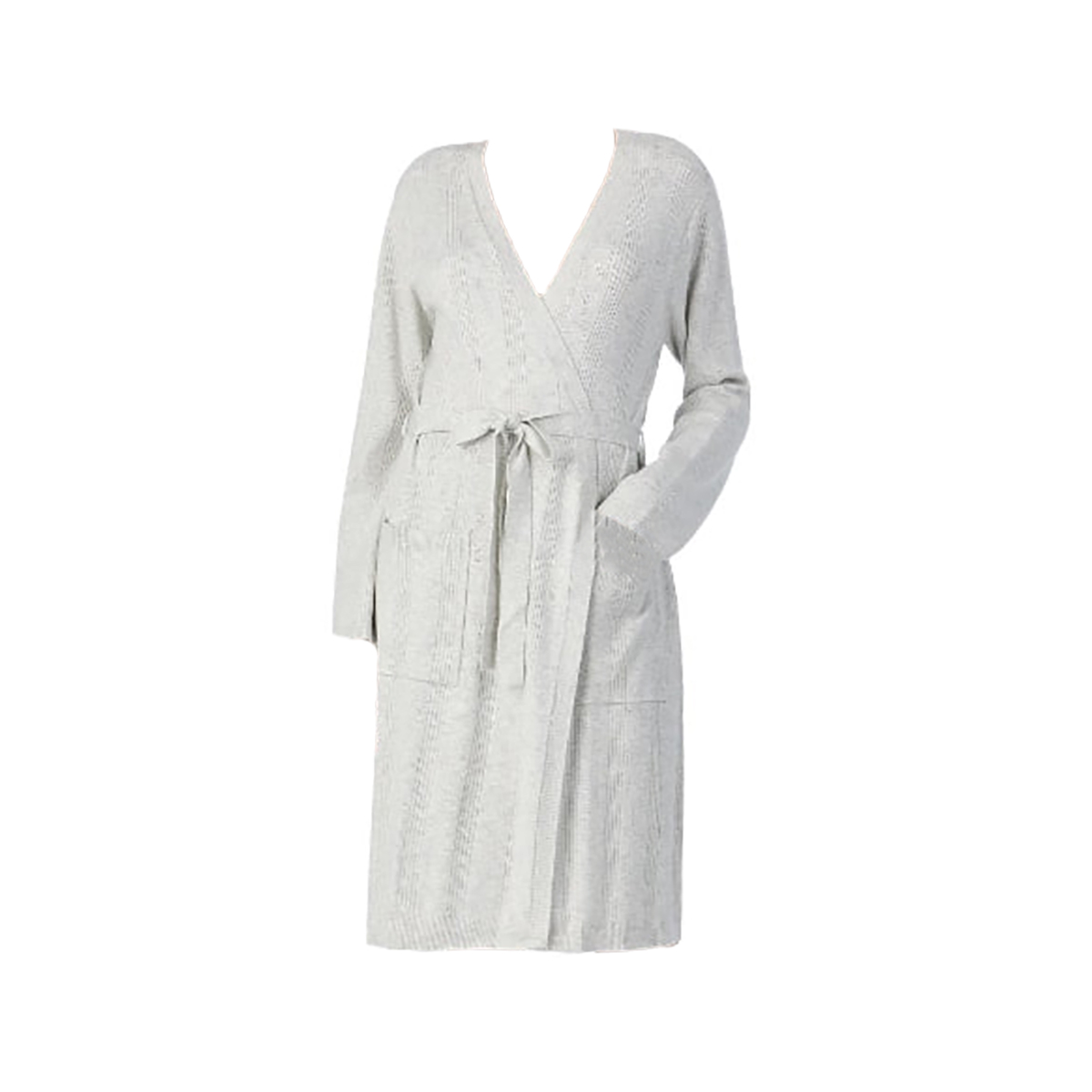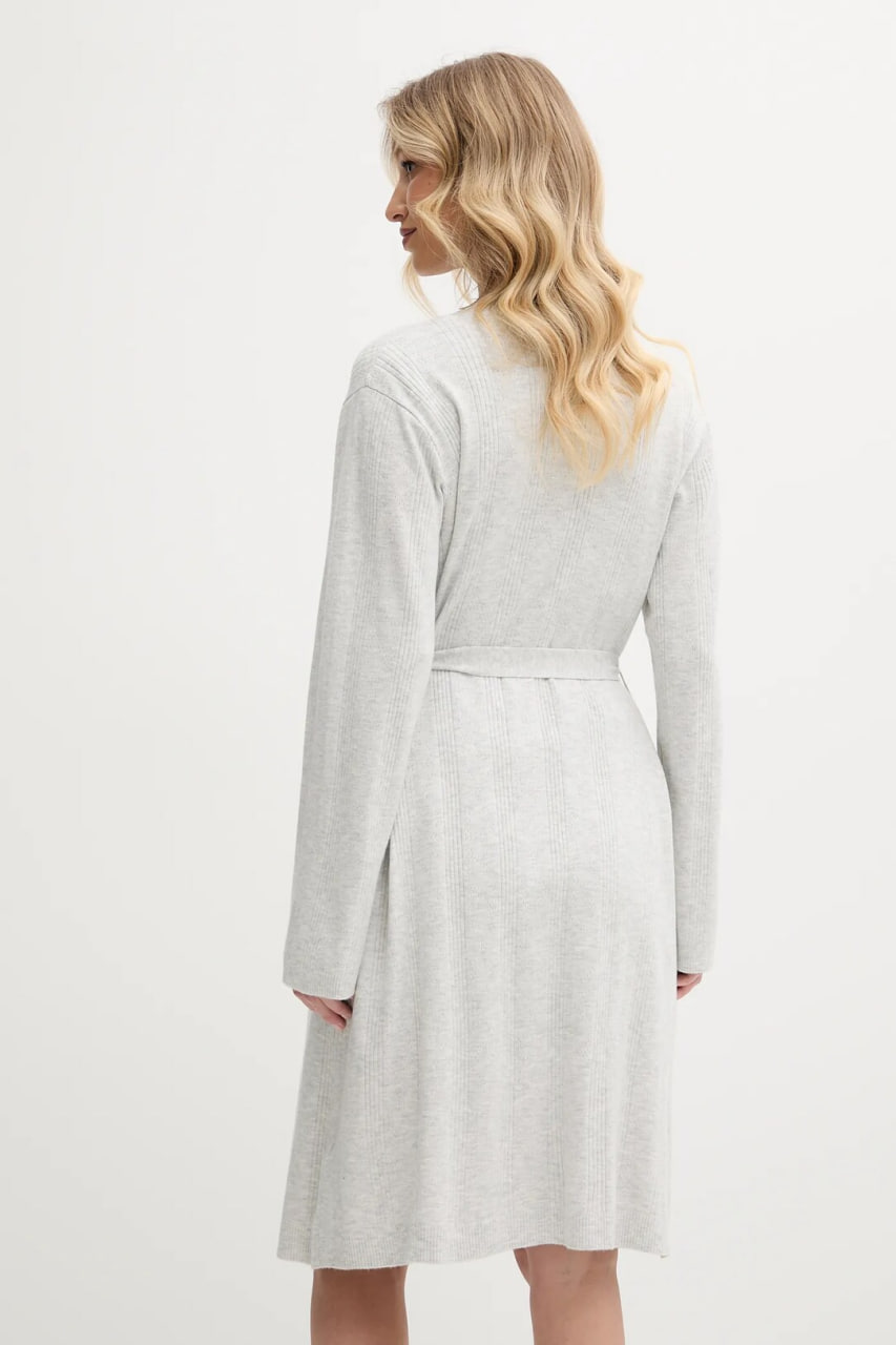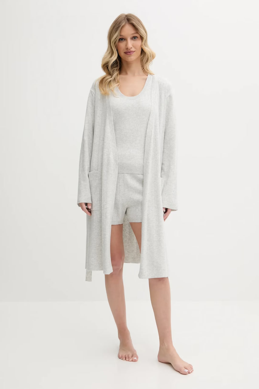 Короткий домашній халат вільного крою, виготовлений з тонкого еластичного трикотажу, приємного до тіла. Модель доповнена двома бічними кишенями для зручності та текстильним поясом, який підкреслює талію та забезпечує комфортну посадку.