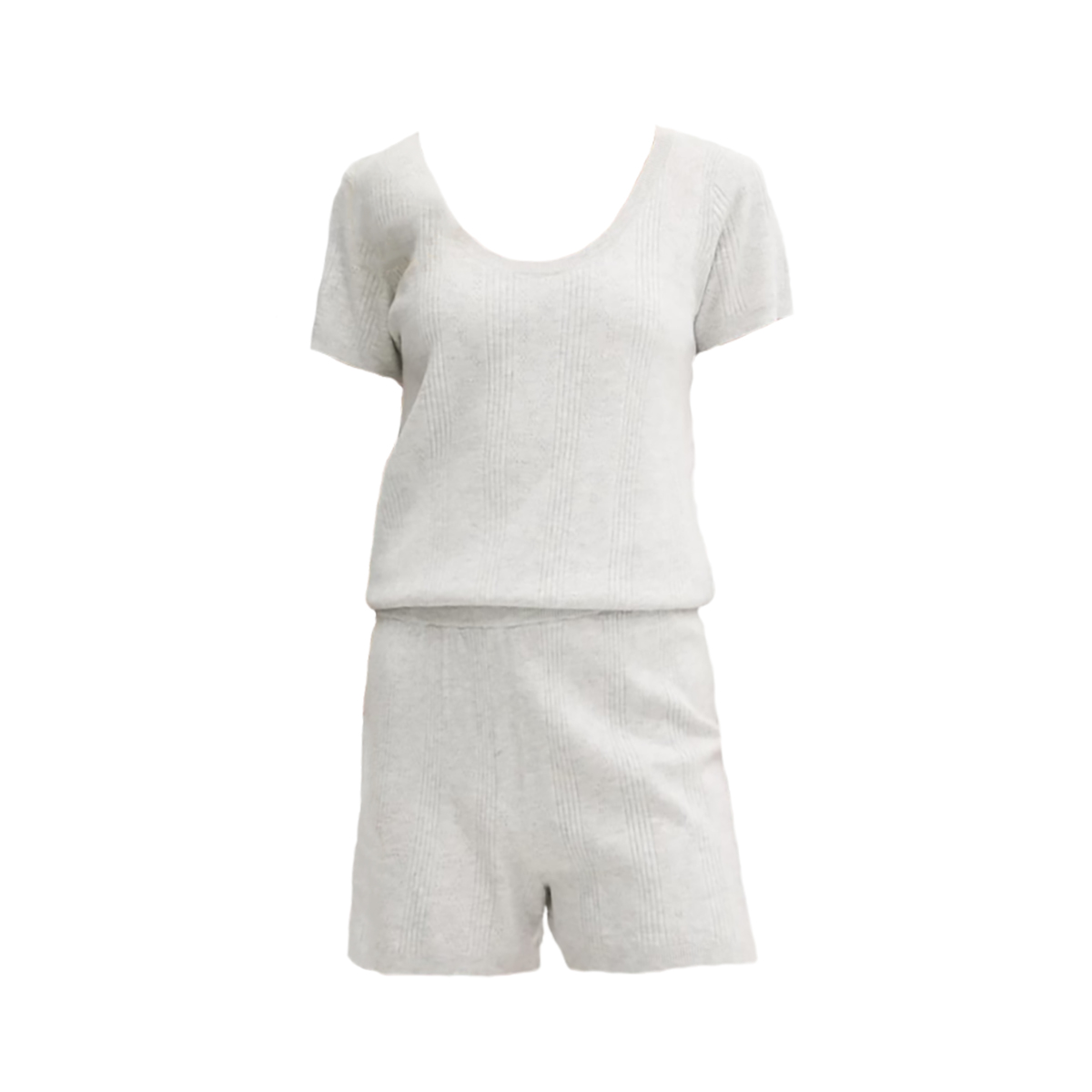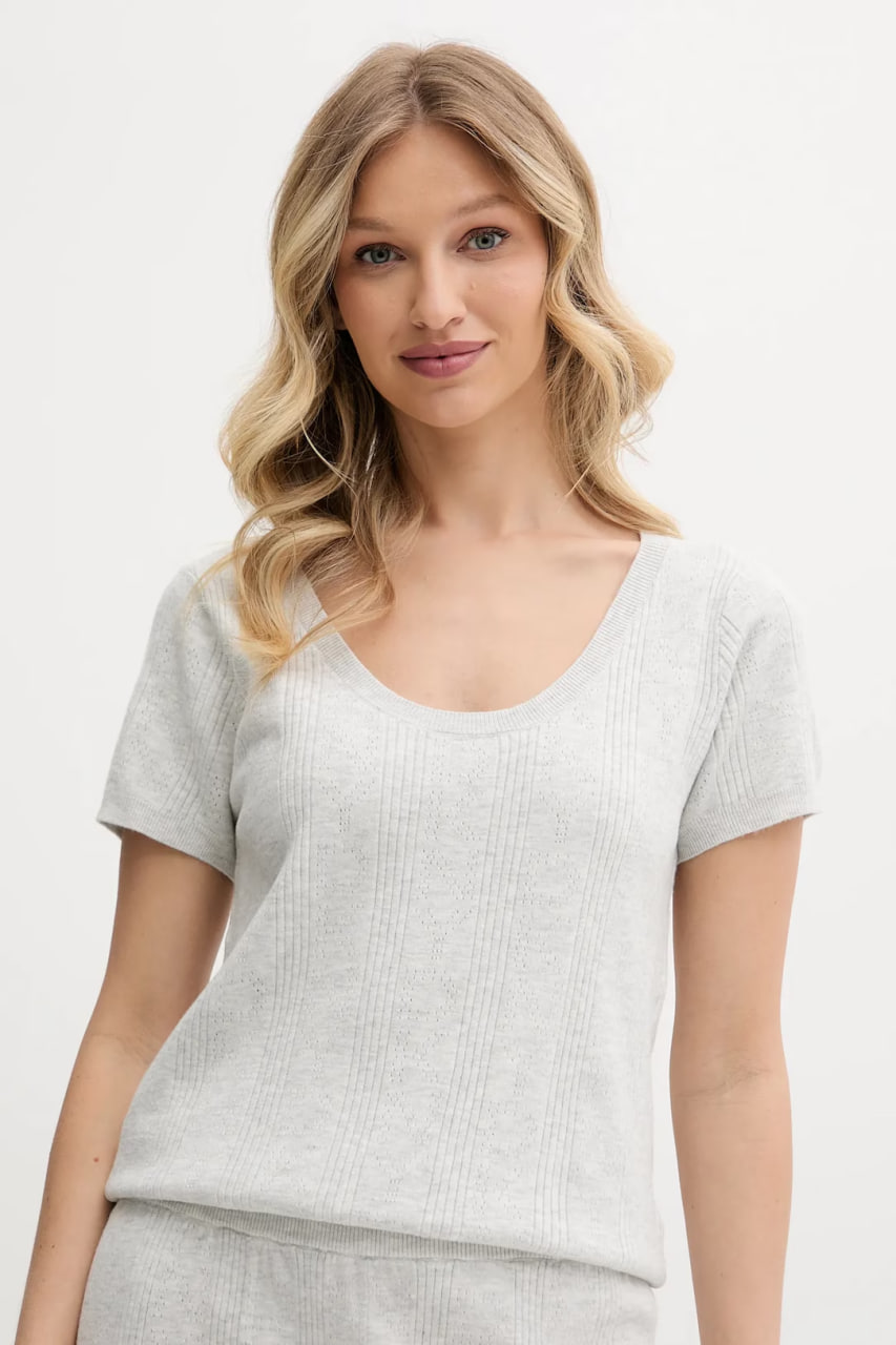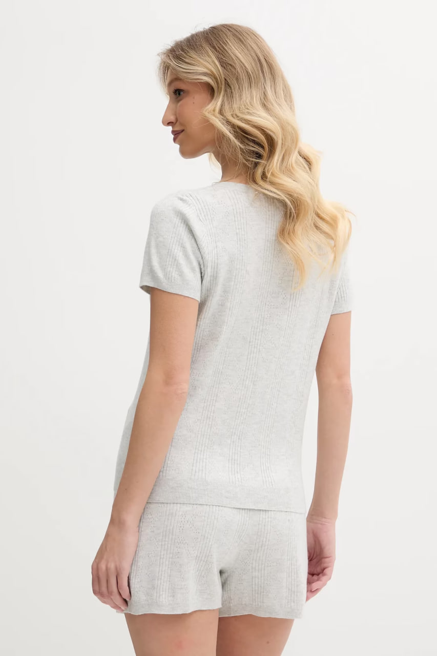 Піжама простого і комфортного фасону, що не стискає рухів, складається з футболки з короткими рукавами та вільних шортів. Модель виготовлена з тонкого еластичного трикотажу. Футболка має жіночний V-подібний виріз, а шорти доповнені еластичною резинкою на поясі для ідеальної посадки.