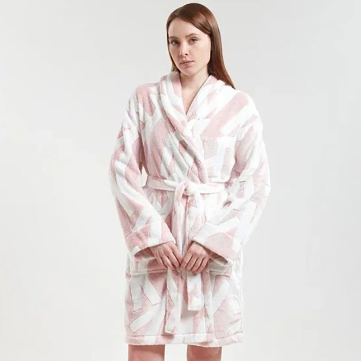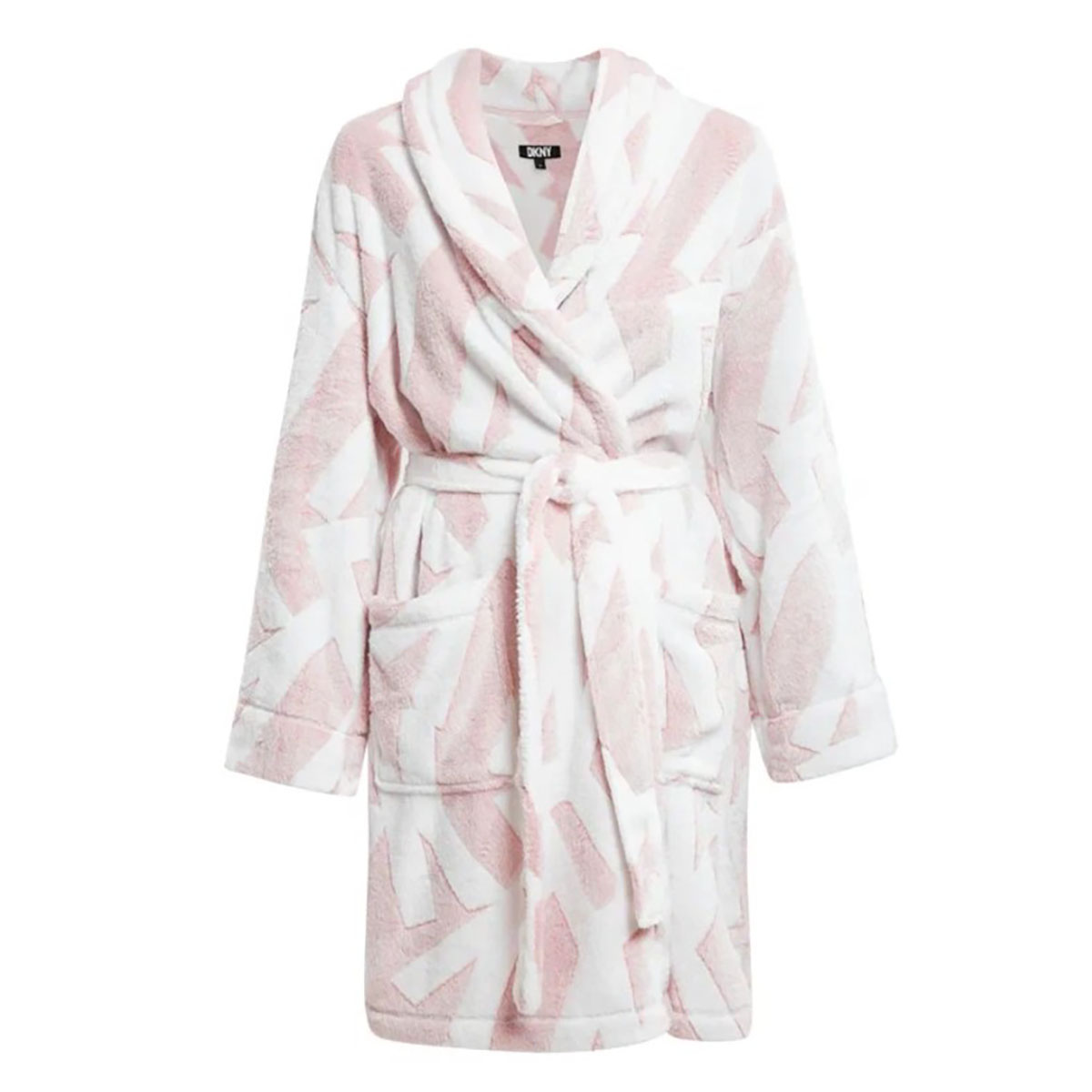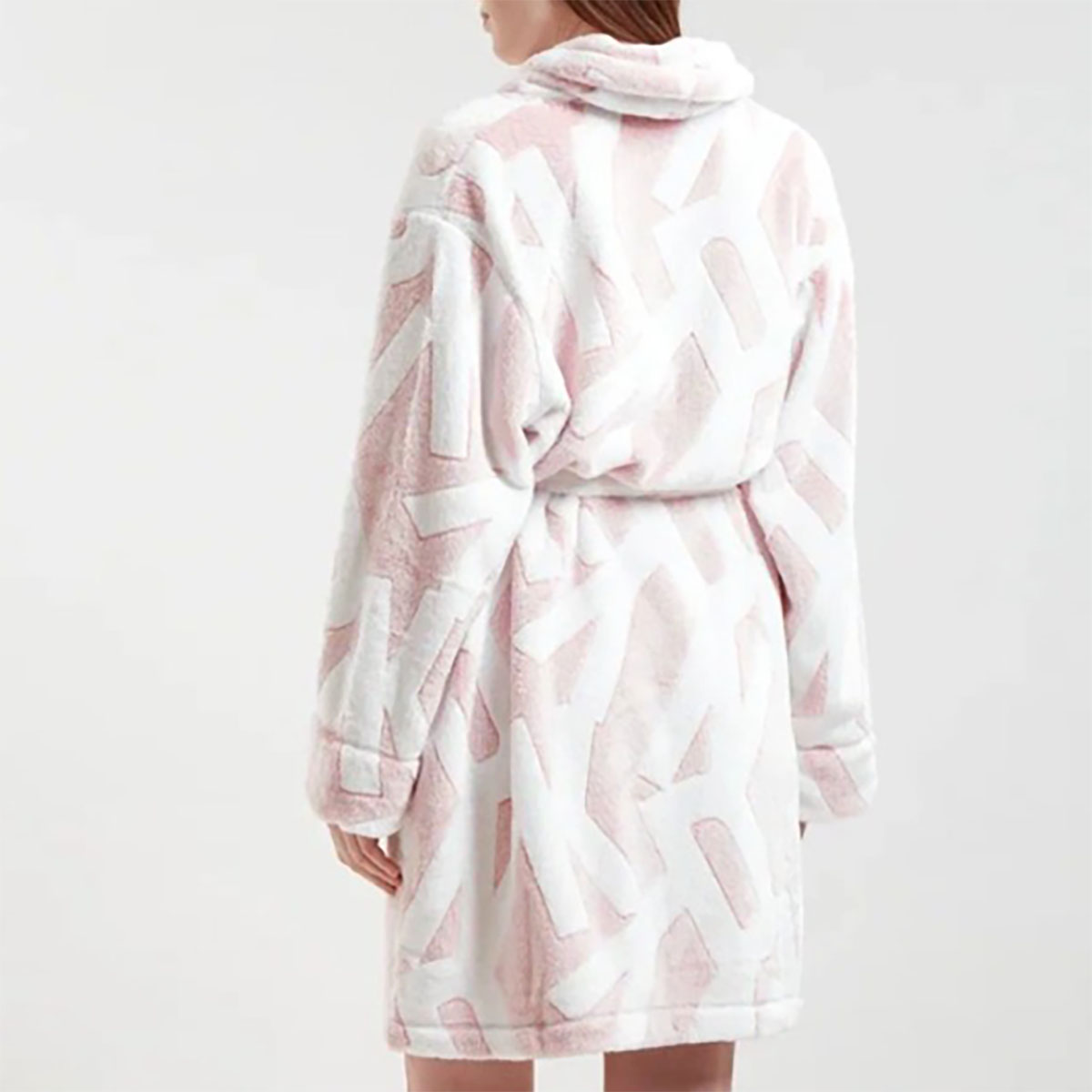 Довгий махровий халат вільного крою прикрашений принтом з логотипом DKNY. Виконаний з м'якої тканини зігріє та подарує відчуття м'якості та комфорту. Довгі широкі рукави із манжетами не сковують рухів. Модель доповнюють масивний комір, знімний пояс та бічні кишені.
