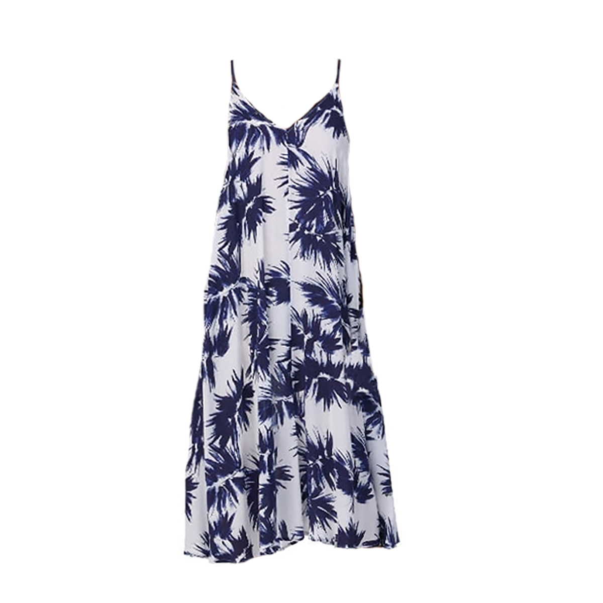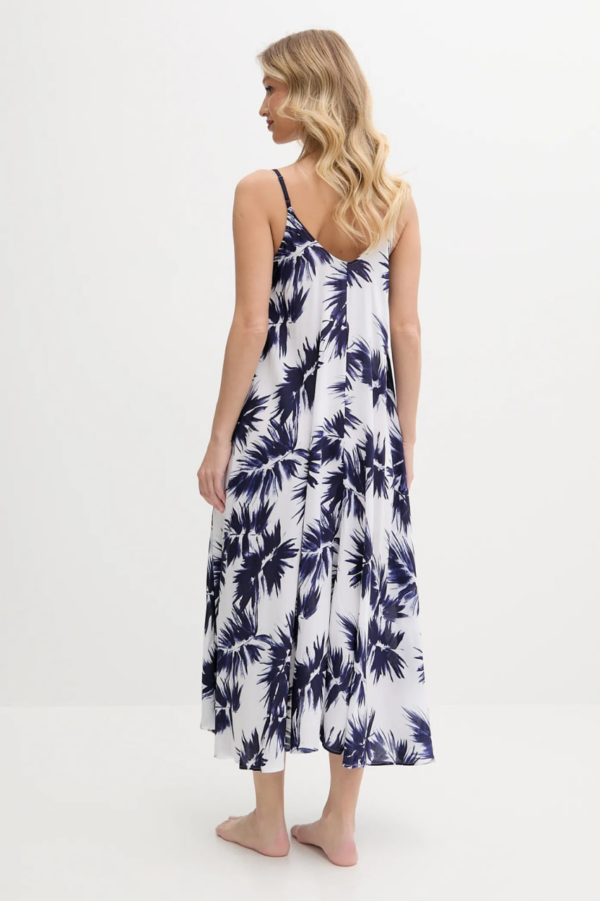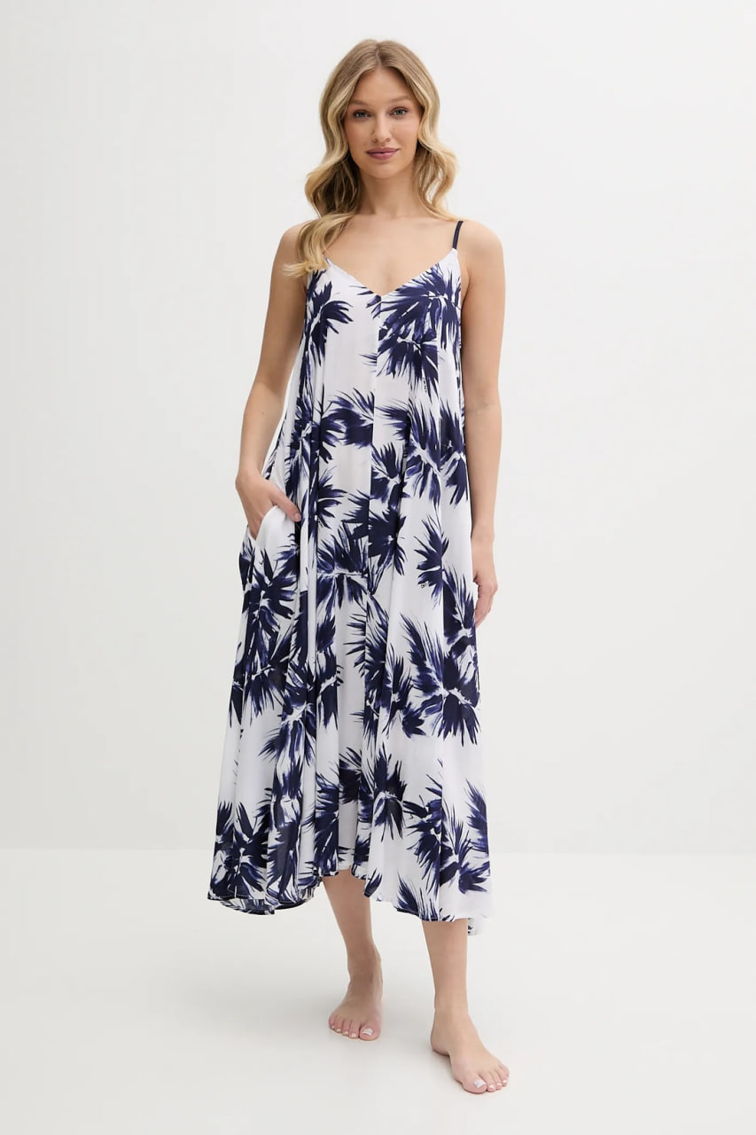 Довга комбінація розклешеного фасону вільного крою, виконана з надзвичайно комфортного матеріалу, що дихає, який приємно відчувається на тілі. Модель має елегантний V-подібний виріз і тонкі регульовані бретелі, що не відстібаються. Практичні накладні кишені на бічних панелях надають образу повсякденної функціональності.