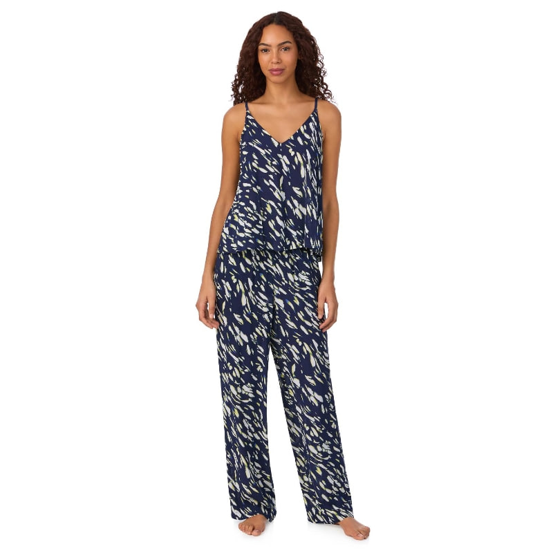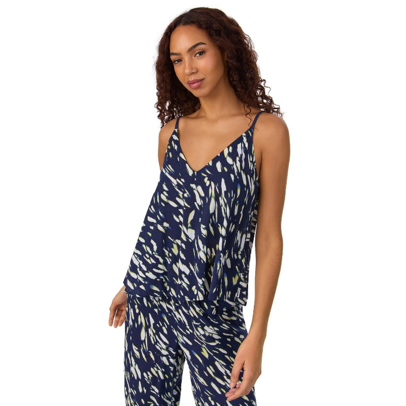 Піжама вільного крою, що складається з майки та штанів, виконана з тонкої, нееластичної та дихаючої тканини, що забезпечує максимальний комфорт у спекотні ночі. Майка на тонких бретелях, що не відстібаються, з V-подібним вирізом елегантно підкреслює зону декольте. Штани на еластичній резинці із зав'язками для зручної посадки, доповнені двома бічними кишенями для практичності.