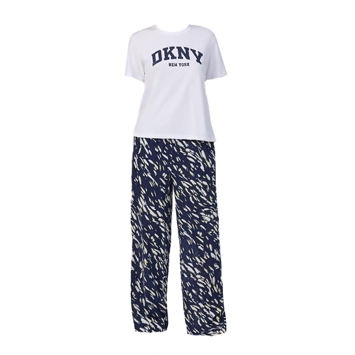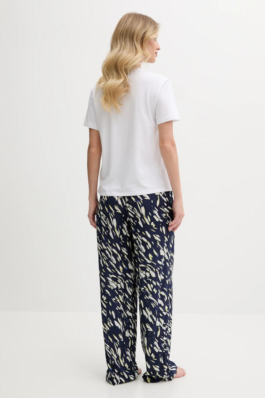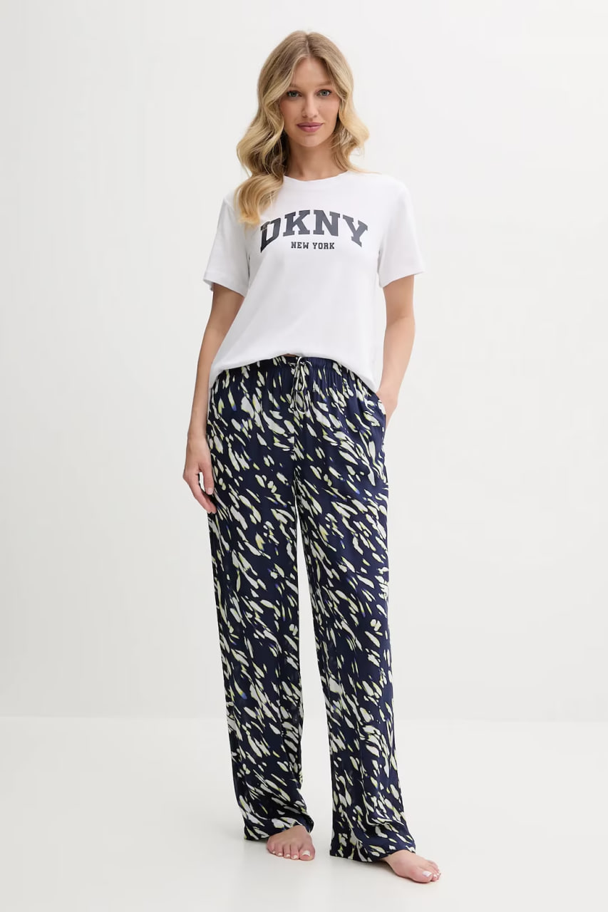 Піжама вільного крою, що складається з футболки та штанів, виконана з неймовірно м'якого та дихаючого матеріалу з високим вмістом бавовни. Футболка з короткими рукавами та круглим вирізом прикрашена логотипом DKNY на передній панелі. Штани з еластичною резинкою на талії із зав'язками, яка забезпечує ідеальну посадку та додатковий комфорт.