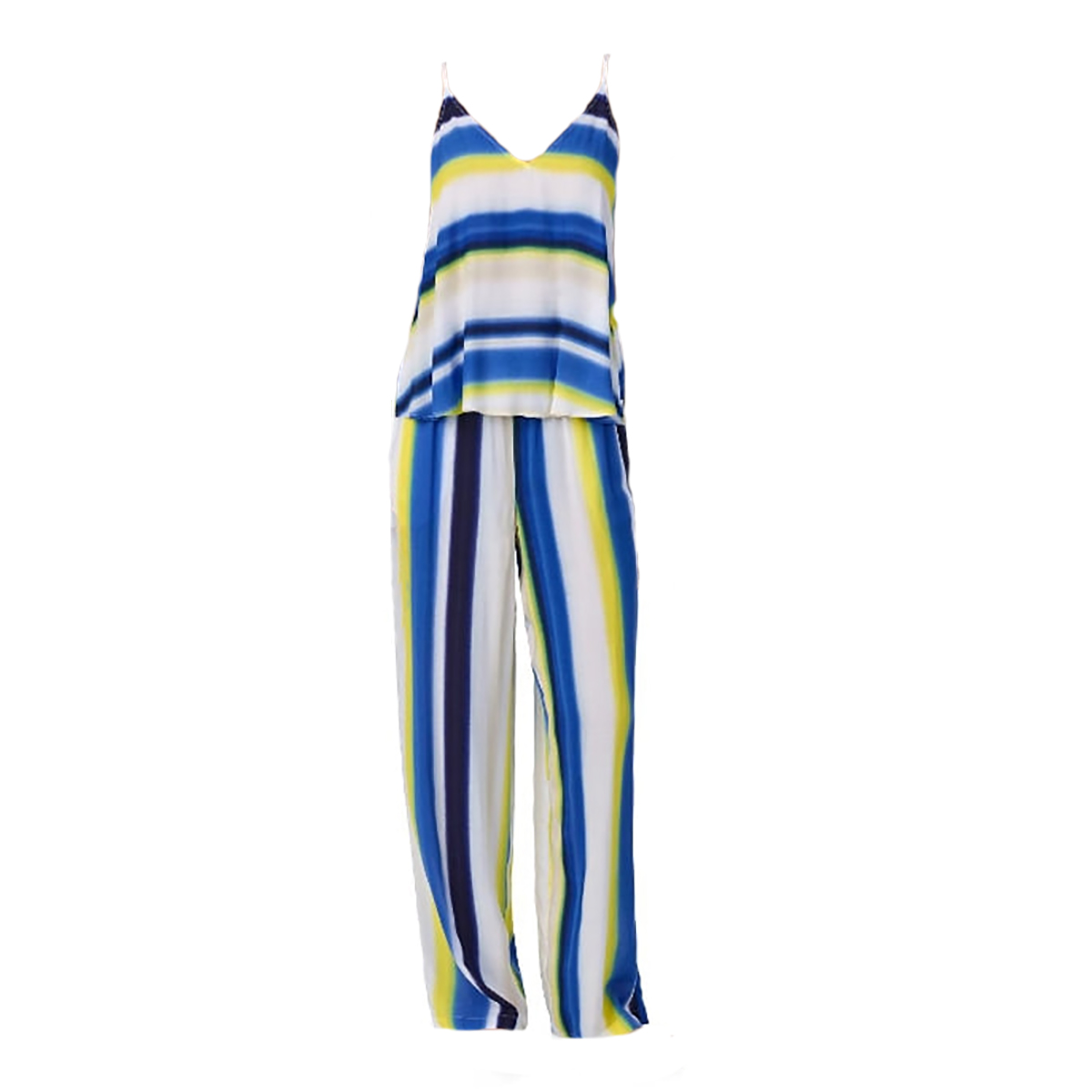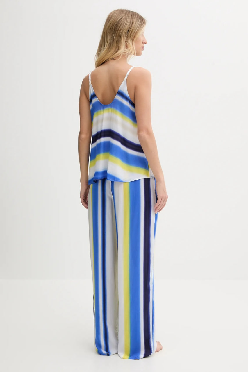 Піжама вільного крою, що складається з майки та штанів, виконана з тонкої, нееластичної та дихаючої тканини, що забезпечує максимальний комфорт у спекотні ночі. Майка на тонких бретелях, що не відстібаються, з V-подібним вирізом елегантно підкреслює зону декольте. Штани на еластичній резинці із зав'язками для зручної посадки, доповнені двома бічними кишенями для практичності.