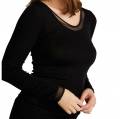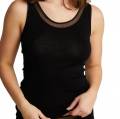 Майка на тонких бретелях, що регулюються. Верхній край передньої панелі декорований невеликою вставкою із тюлю.