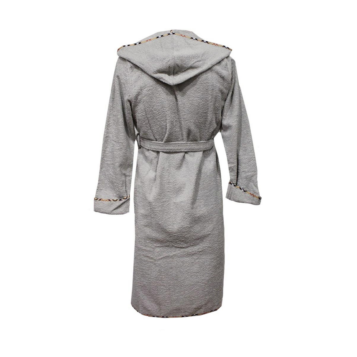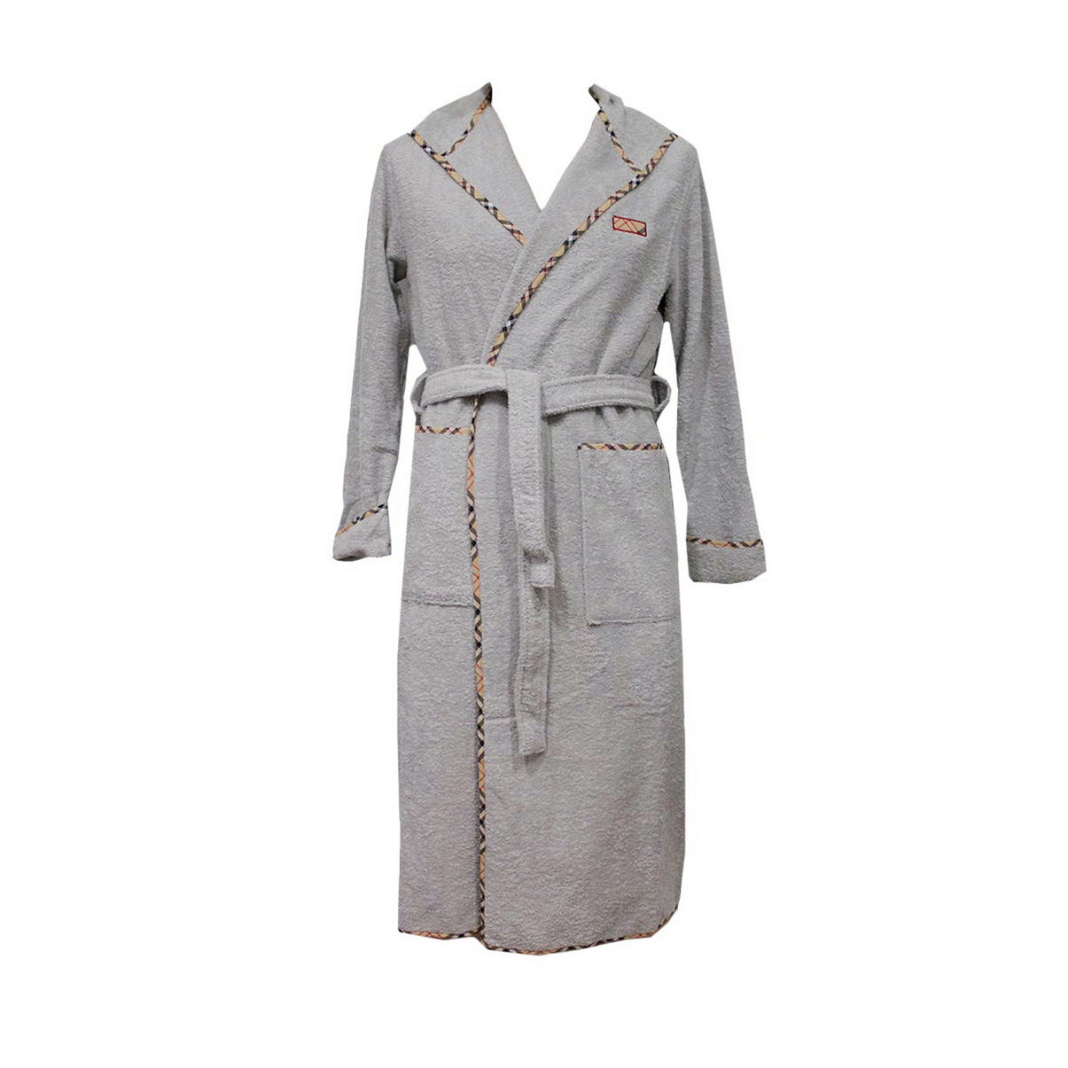 Махровий халат з капюшоном. Ціліснокроєне махрове полотно, вшитий рукав. Накладні кишені, знімний пояс для комфорту. Виріб декорований контрастною тасьмою (у клітину).