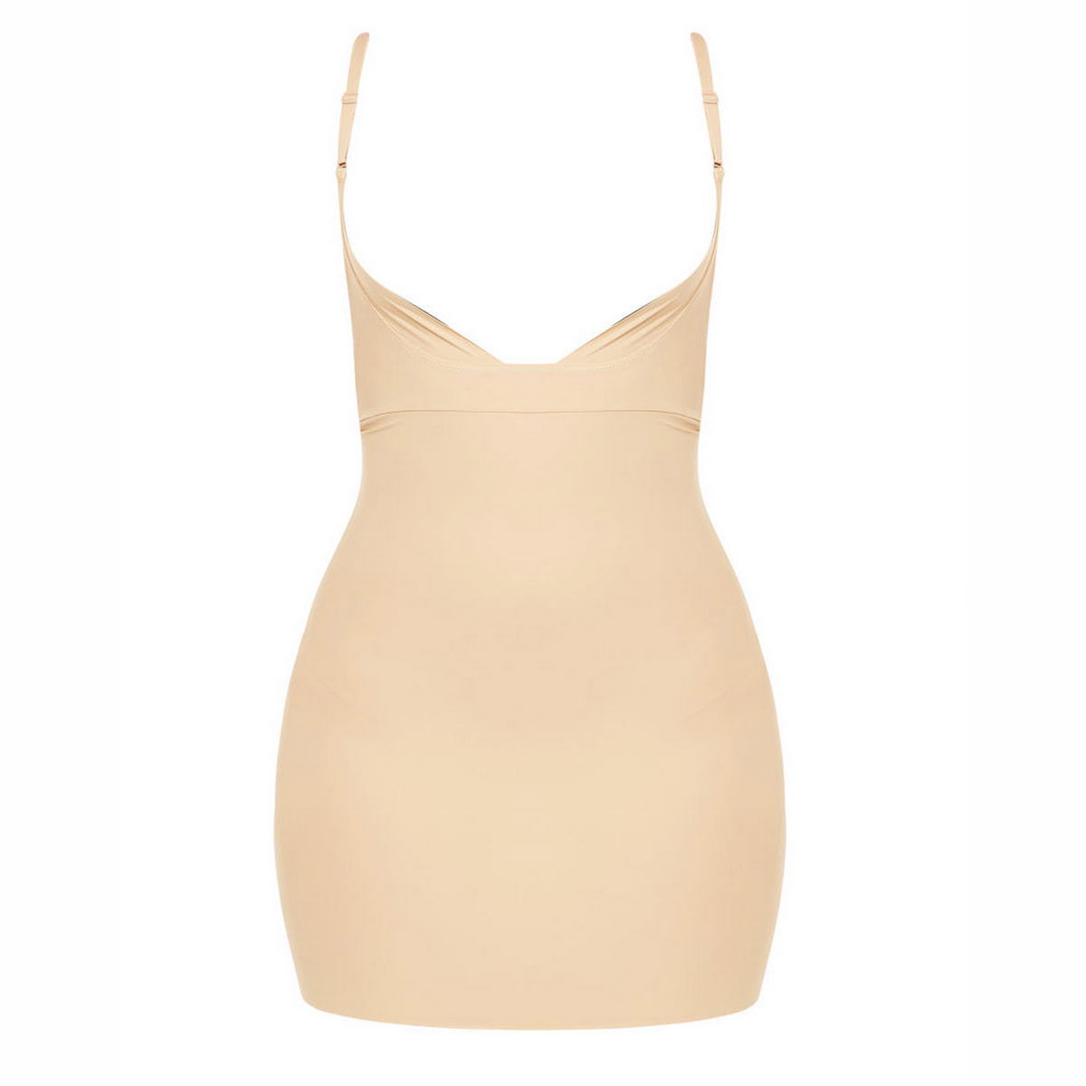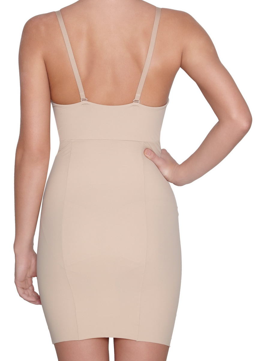 Сукня виготовлена з м'якої мікрофібри з плоскими бічними та задніми швами. У сукні інтегрований боді, який виконано із щільної тканини – для візуальної корекції торсу. Боді на застібці, з бавовняною ластовицею. Візуальна корекція від лінії грудей до середини лінії стегон. Регулюючі бретелі, що відстібаються, мають кілька варіантів для перестібання. "Необроблений" нижній край.