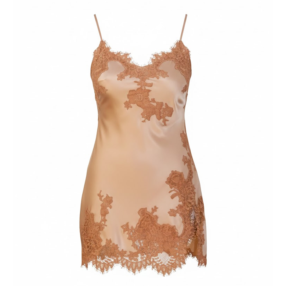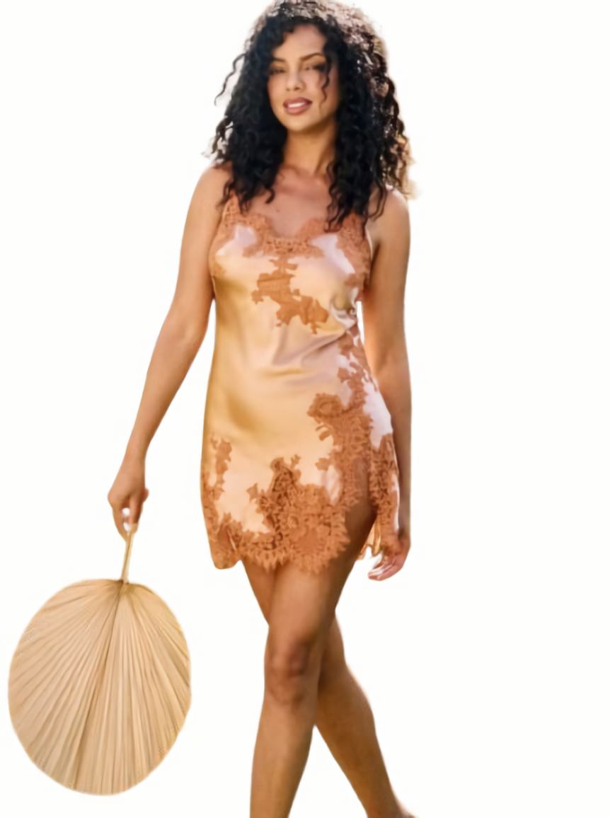 Коротка комбінація вільного крою на тонких бретелях, що регулюються, виконана з гладкого атласного шовку, який дарує відчуття легкості. Модель прикрашена квітковим мереживом, що підкреслює її витончений характер. Передня панель доповнена невеликим розрізом по нижньому краю - делікатною деталлю, яка додає спокусливості та витонченості образу.