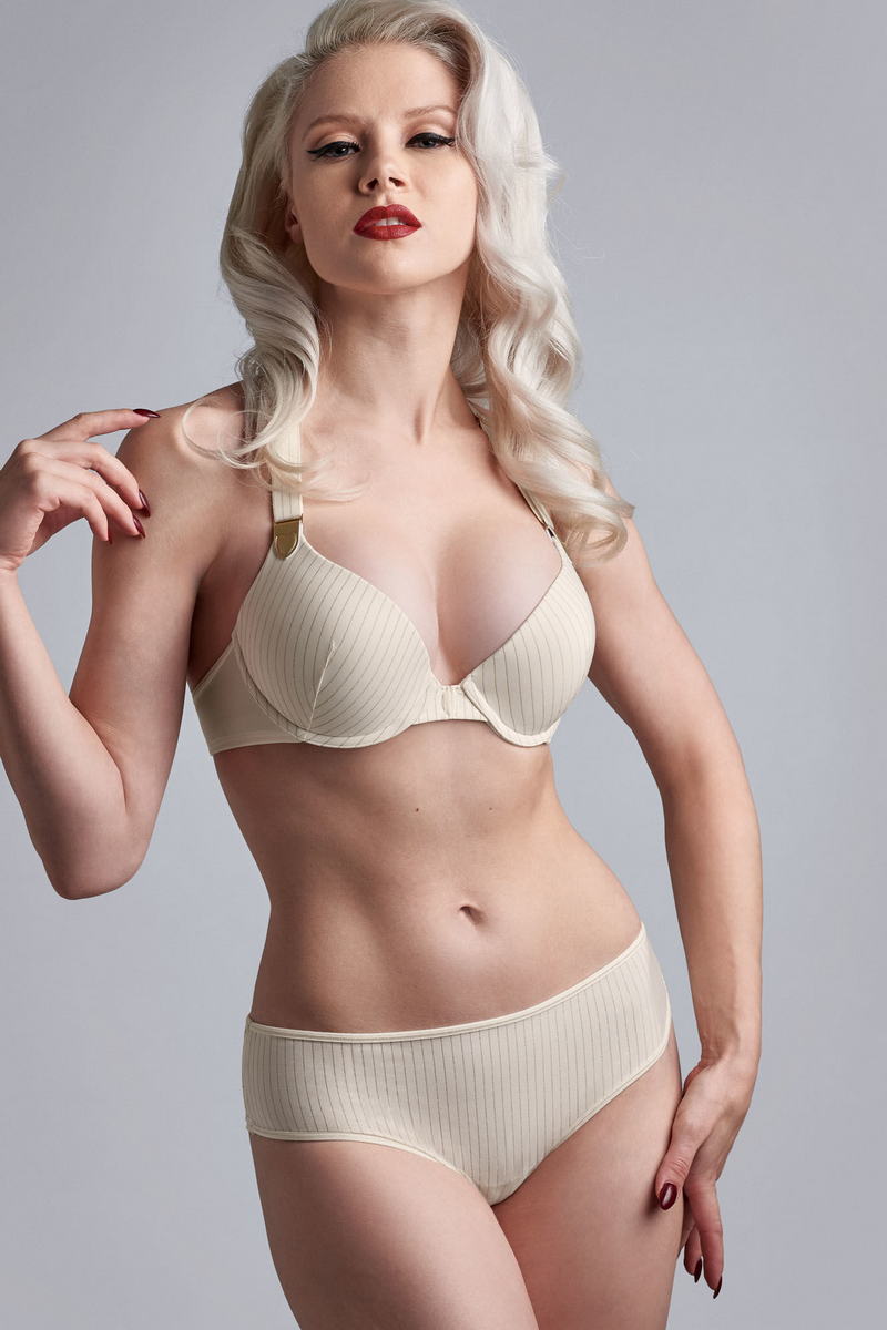 Пуш ап із щільною чашкою та дуже глибоким та відвертим вирізом. Завдяки маленьким вкладишам у чашках і близько розташованим один до одного кісточкам він злегка піднімає та зсуває груди до центру. Оригінальне кріплення бретелів спереду, що зливаються в одну на спинці. Дуже відверта та сексуальна форма. Застібається на центральній панелі за допомогою "заклепки".