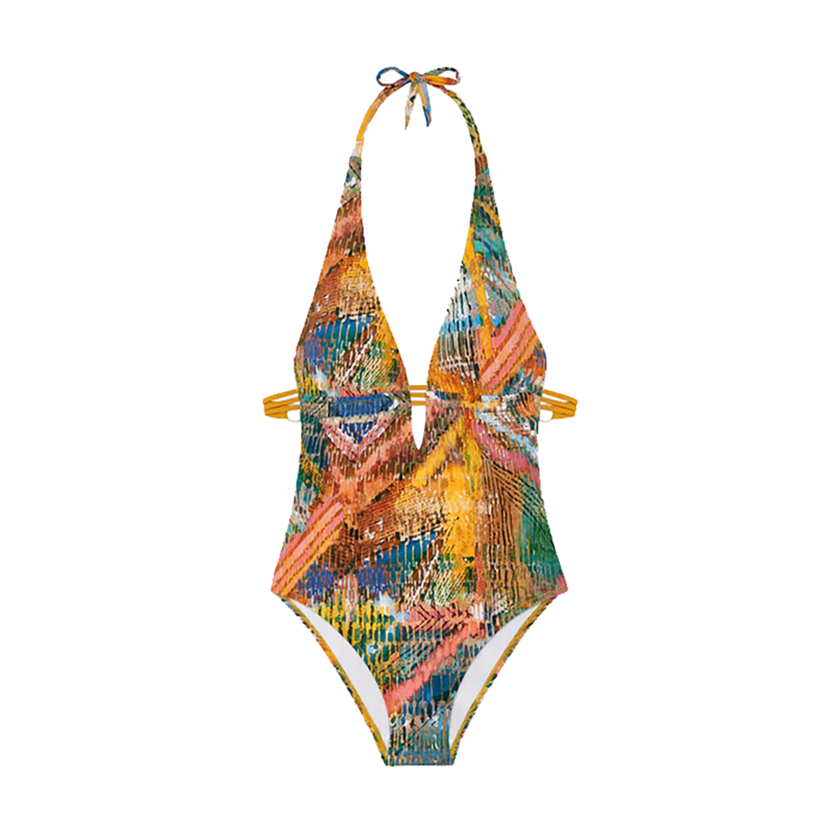 Цілісний купальник з глибоким вирізом, виконаний з міцної еластичної тканини, він чудово сідає по фігурі, забезпечуючи комфорт та підтримку. М'які чашки, що знімаються, дозволяють регулювати об'єм і форму грудей, а розташовані під ними потрійні бретелі додають оригінальності. Модель зав'язується на шиї та спинці, створюючи витончений силует. Частково прикрита спинка надає образу загадковості та витонченості.