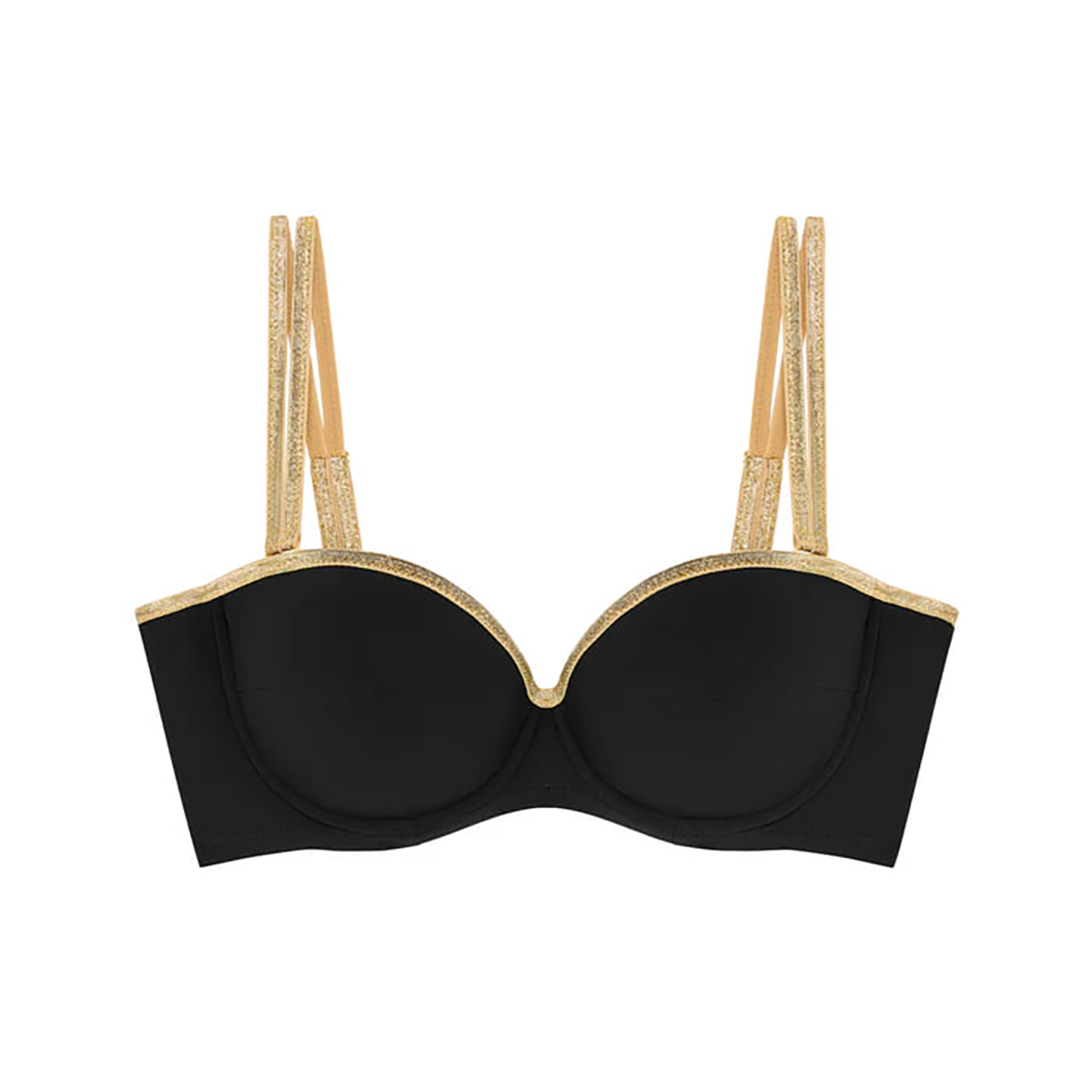 Бюстгальтер-бандо зі злегка ущільненою формою чашок на кісточках, які забезпечують бездоганну підтримку та комфорт. Подвійні люрексові бретелі, що відстібаються, додають мерехтливий акцент і дозволяють зав'язувати їх різними способами, адаптуючи модель під будь-який образ — класичний, перехрещений або на одне плече.