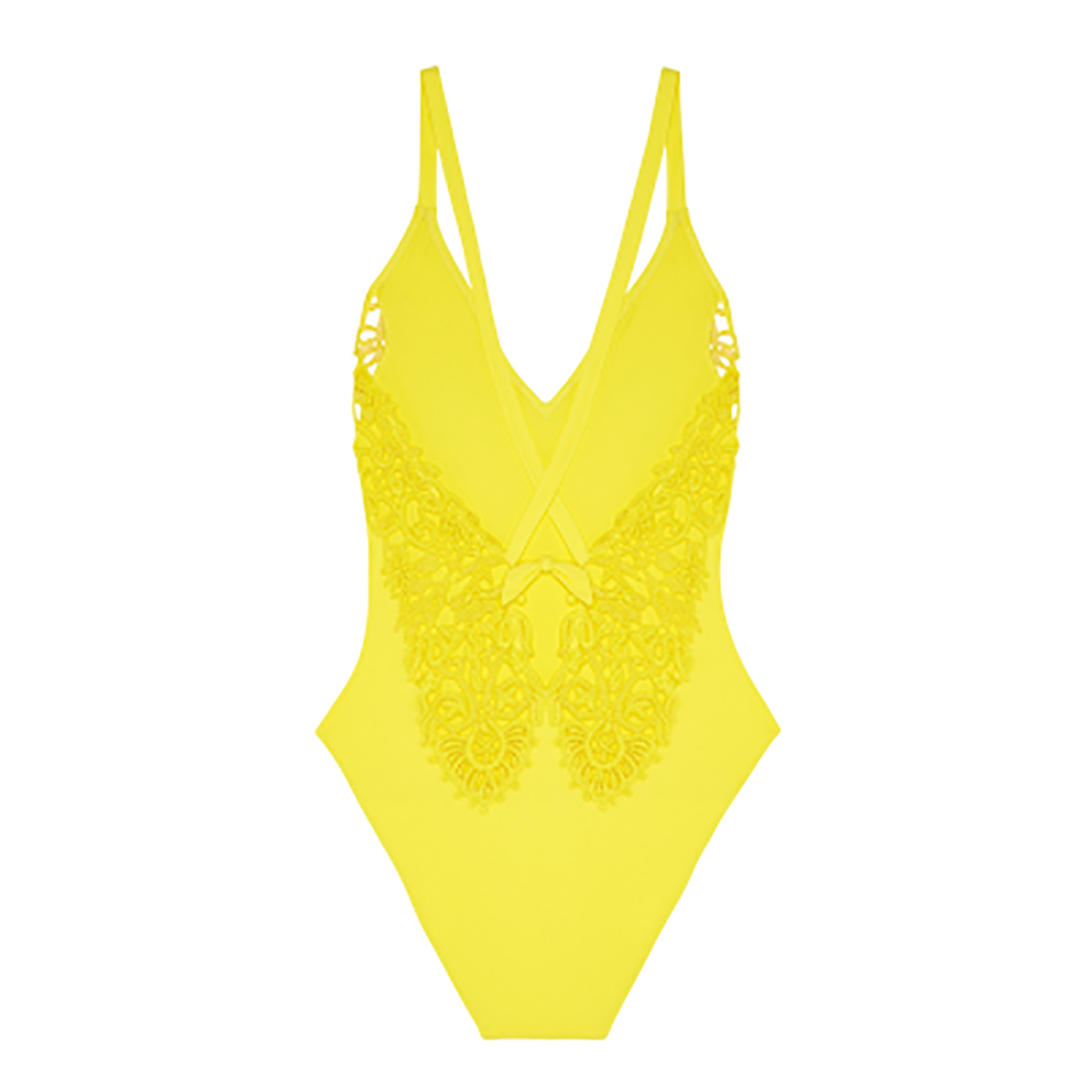 Цілісний купальник з глибоким V-подібним вирізом, декорований ажурною вишивкою. Відкрита спинка привертає увагу та підкреслює витонченість силуету, а зав'язки на задній панелі забезпечують ідеальну посадку та комфорт.