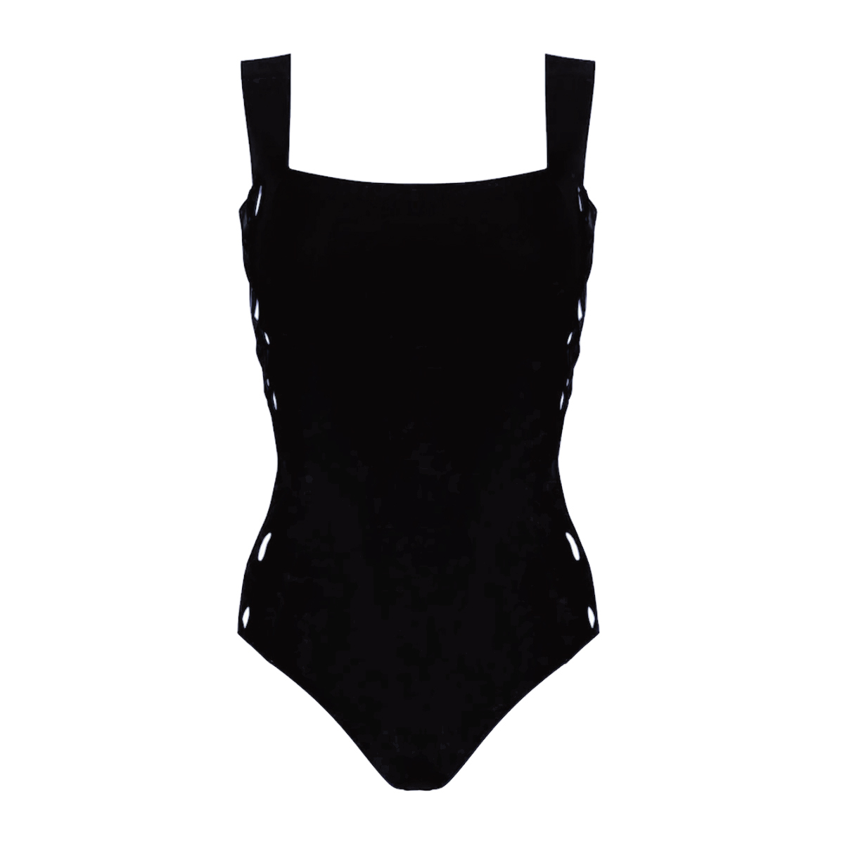 Цілісний купальник створений для комфорту та спокусливого силуету. Модель без чашок та кісточок забезпечує природну посадку, а широкі бретелі дарують комфорт та підтримку. Тонкий еластичний матеріал м'яко облягає фігуру, підкреслюючи її лінії. Особливий акцент роблять бічні панелі, прикрашені еластичними стрічками, що перехрещуються.