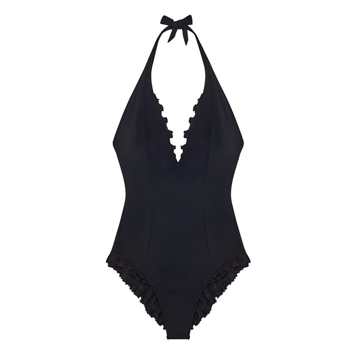 Ультражіночний цільний купальник. Трусики-стрінги та повністю відкрита спинка підкреслюють граціозні лінії тіла, а зав'язки на шиї дозволяють регулювати посадку. Глибокий V-подібний виріз привертає увагу до зони декольте, створюючи витончений та привабливий образ. Особливий шарм моделі надають витончені оборки, що прикрашають зону декольте і краї трусиків - ніжний штрих у бразильському стилі, що додає динаміки та легкості.