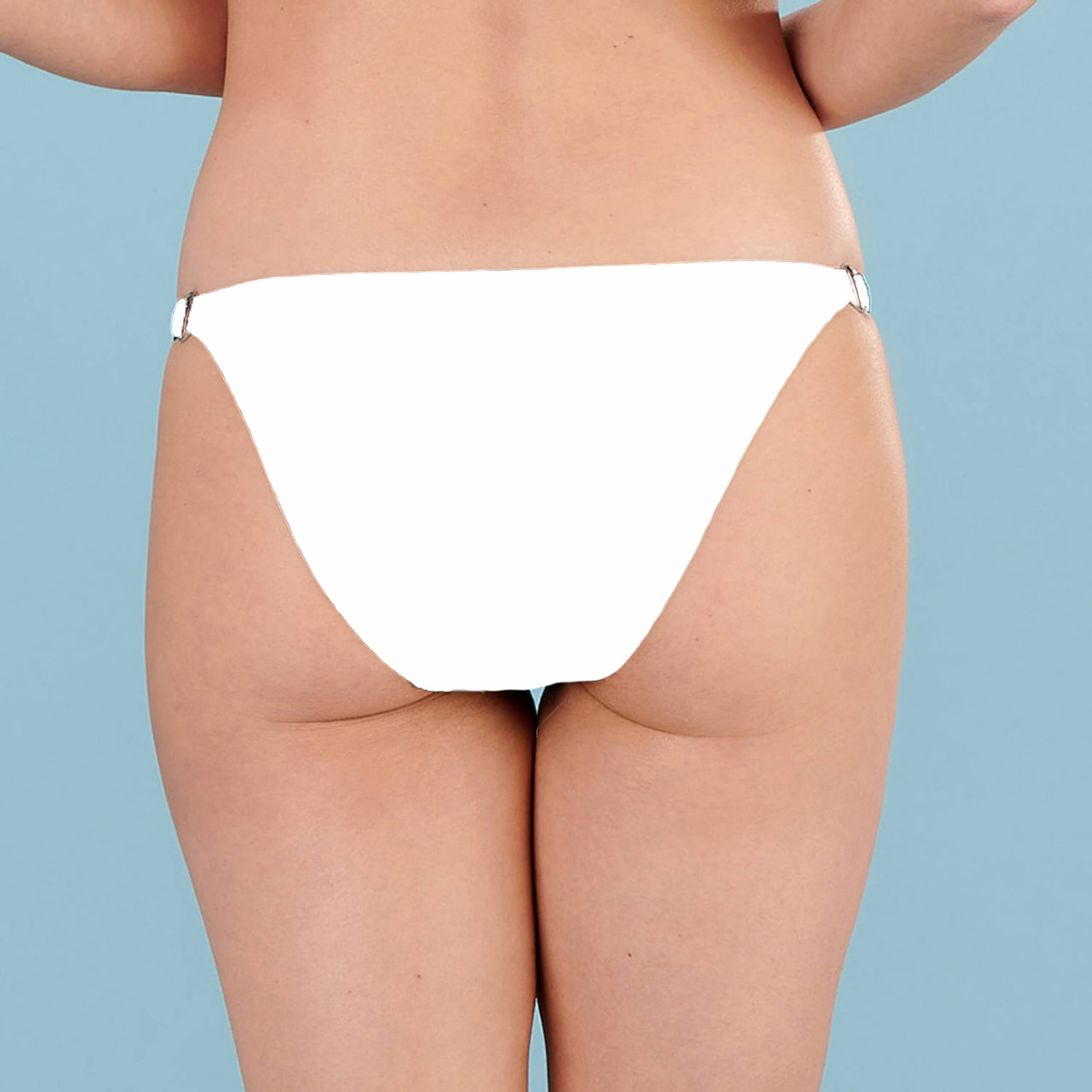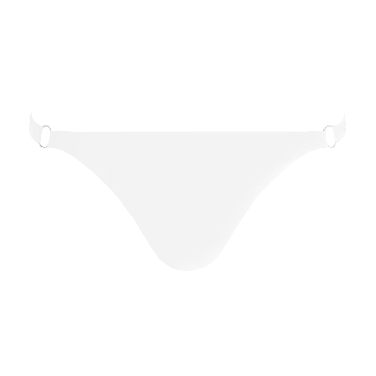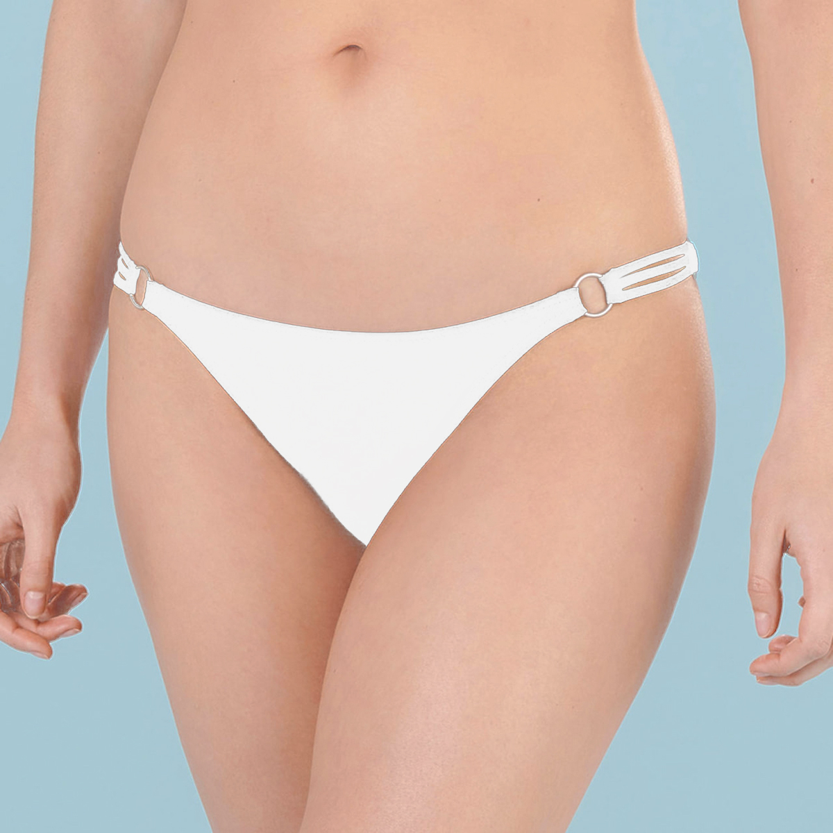 Труси-бікіні із заниженою посадкою. Бічні панелі оздоблені потрійними еластичними бретелями, з'єднаними вишуканими золотими кільцями. Такий декор додає образу витонченості, а продумана конструкція забезпечує комфортну посадку.