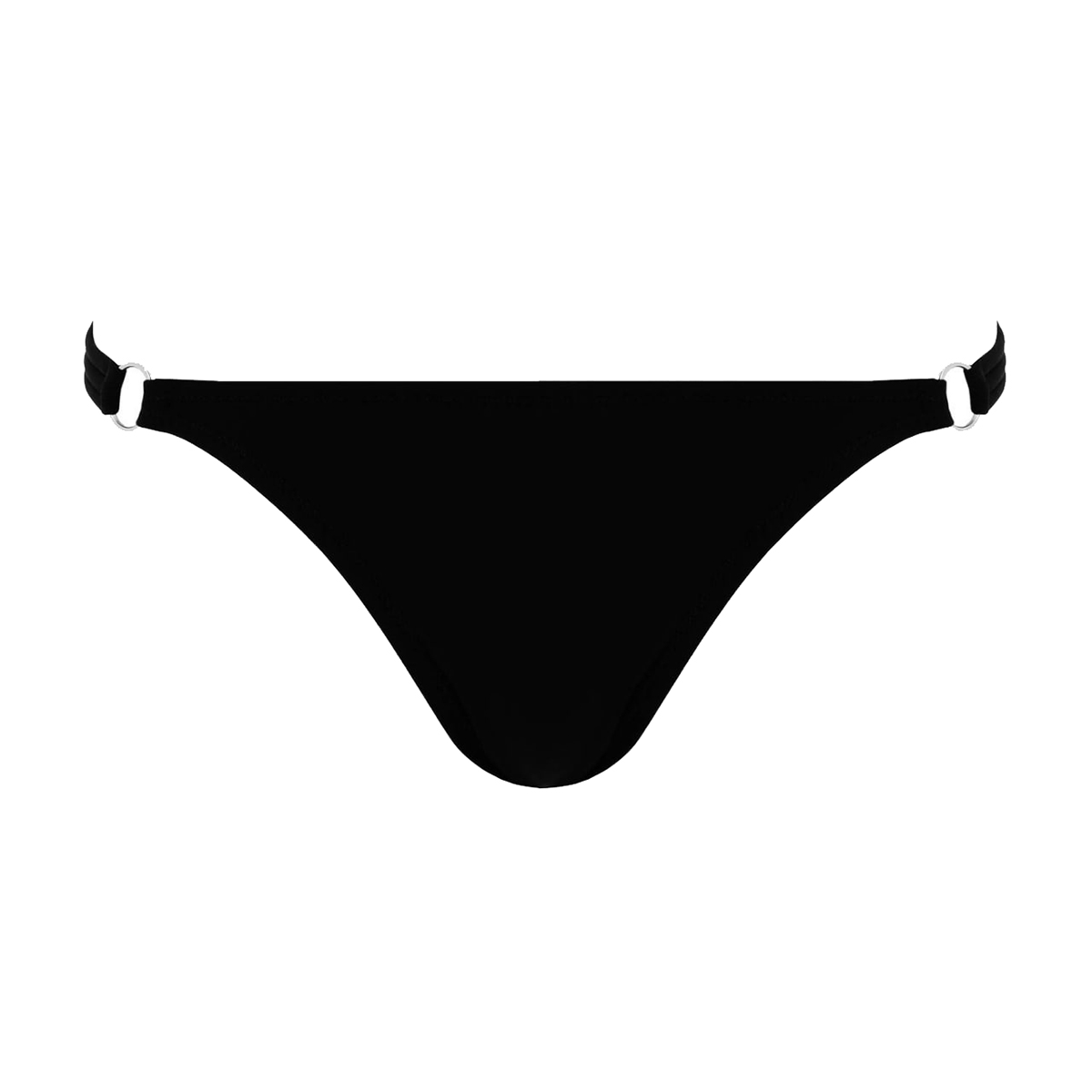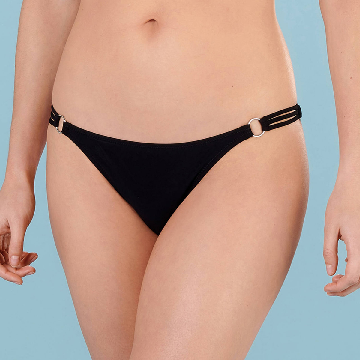 Труси-бікіні із заниженою посадкою. Бічні панелі оздоблені потрійними еластичними бретелями, з'єднаними вишуканими золотими кільцями. Такий декор додає образу витонченості, а продумана конструкція забезпечує комфортну посадку.