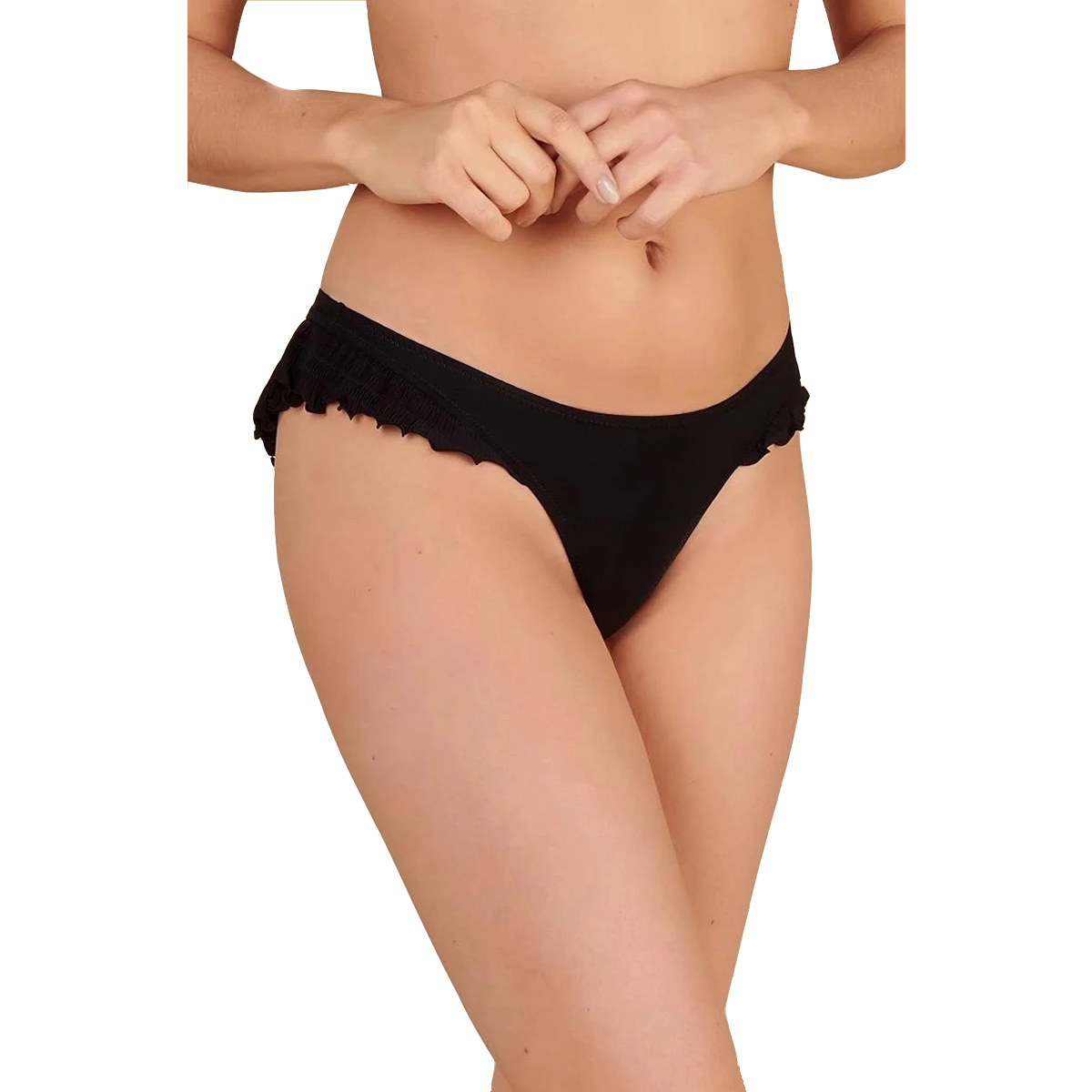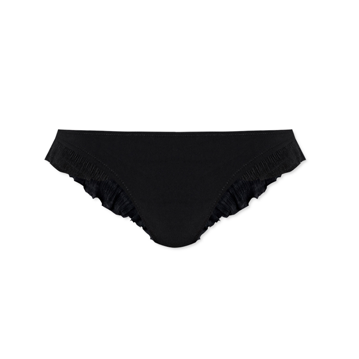 Труси - стрінги із заниженою посадкою. Бічні та задня панелі доповнені плісерованими рюшами.