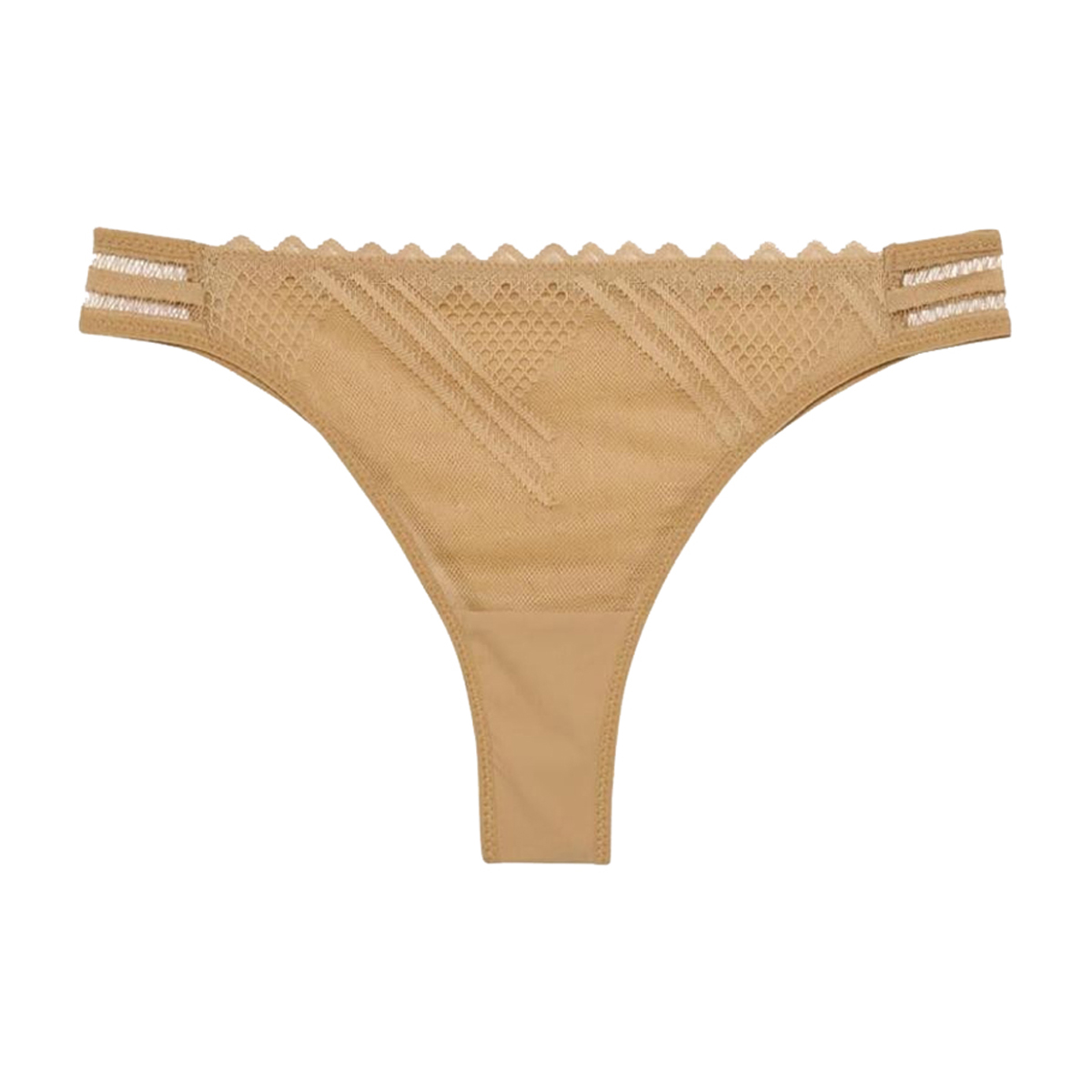 Труси – стрінги із середньо – заниженою посадкою. Передня панель виконана з мережива з графічним орнаментом, з внутрішньої сторони дубльована тюлем для запобігання прозорості. Задня панель – з тюлю. Бічні панелі доповнені мережкою.