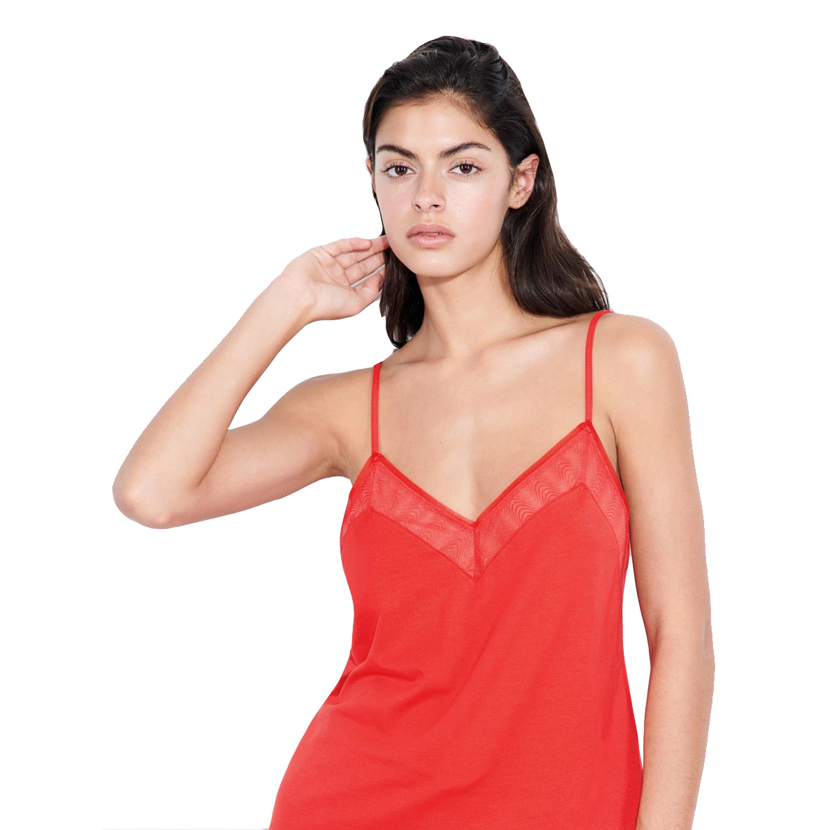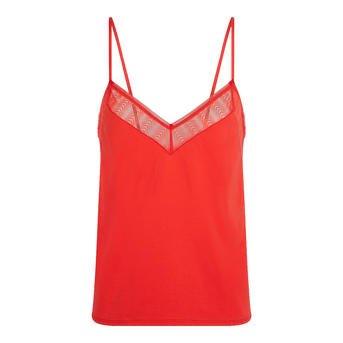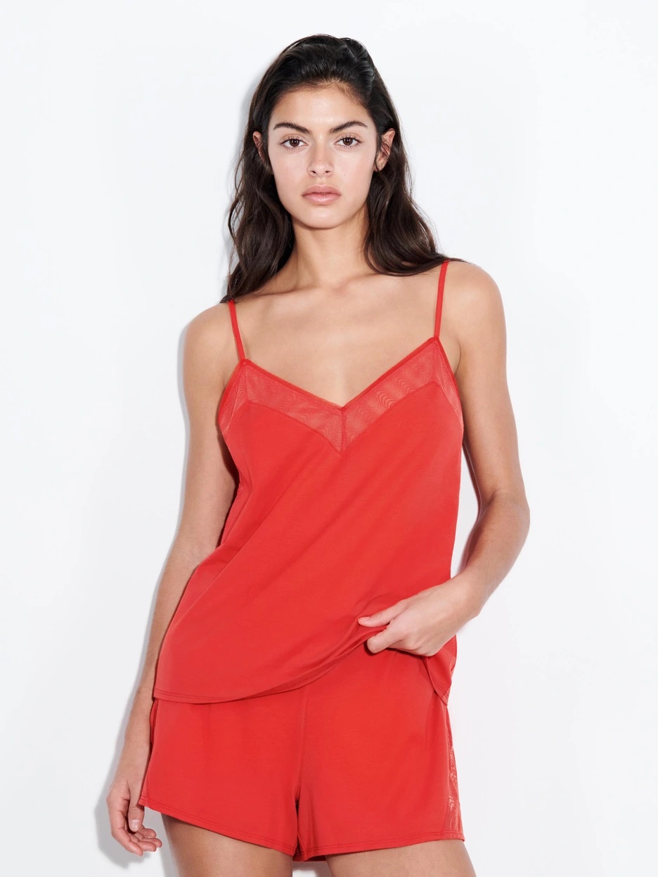 Майка вільного крою на тонких бретелях, що регулюються. V - подібний виріз декольте доповнений вставкою з тюлю. Задня панель - досить відкрита також доповнена вставкою з тюлю.