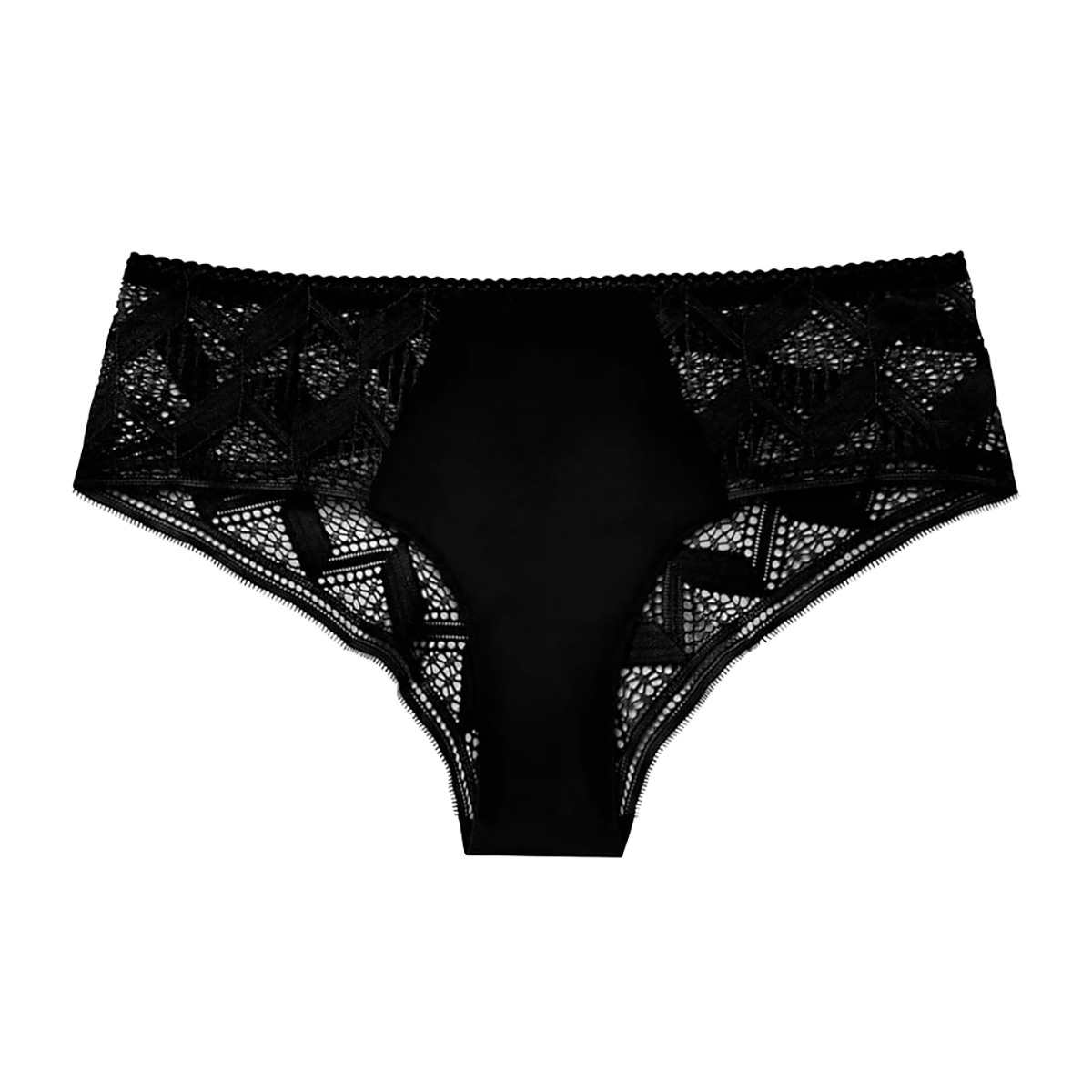 Труси-боксери із середньо-заниженою посадкою. Центральна панель виконана з ніжної та гладкої мікрофібри, а бічні та задня панелі – з витонченого мережива з геометричним орнаментом, що надає моделі вишуканого та жіночного вигляду.