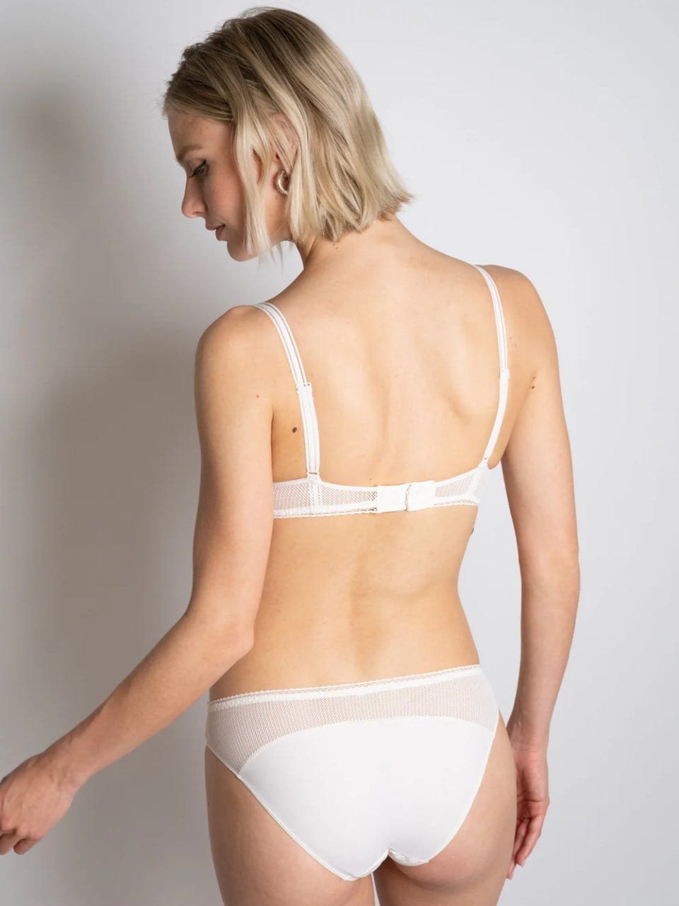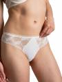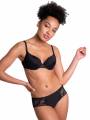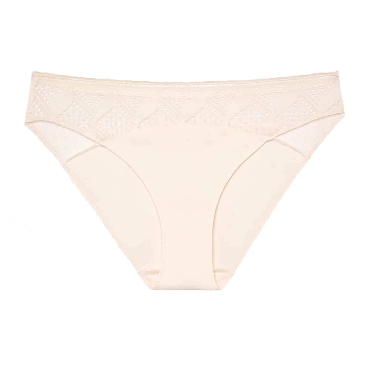 Класичні труси із середньо-заниженою посадкою. Виконані з м'якої, гладкої мікрофібри, яка ніжно окутує тіло. Передня панель прикрашена витонченими вставками з мережива з геометричним орнаментом, що підкреслює елегантність лінії стегон. Задня панель доповнена делікатною сіточкою.
