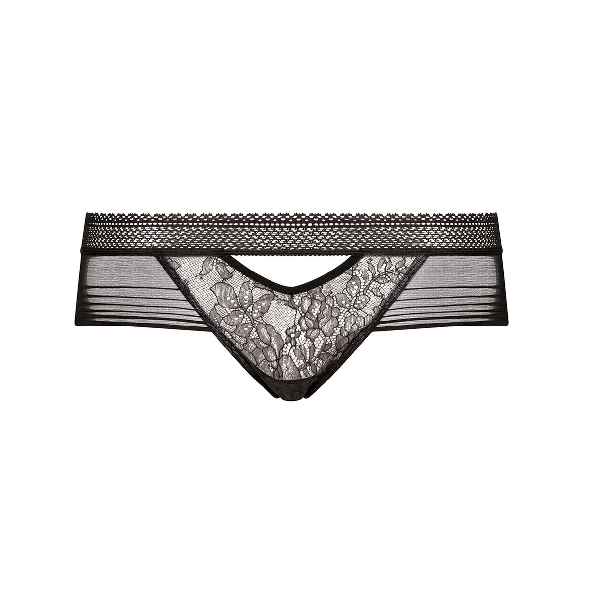 Труси-боксери із середньо-заниженою посадкою. Передня панель виконана з мережива та доповнена вставками із сітки, задня - повністю із прозорої сітки. Верхній край доповнений декоративною тасьмою.