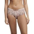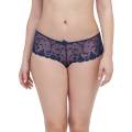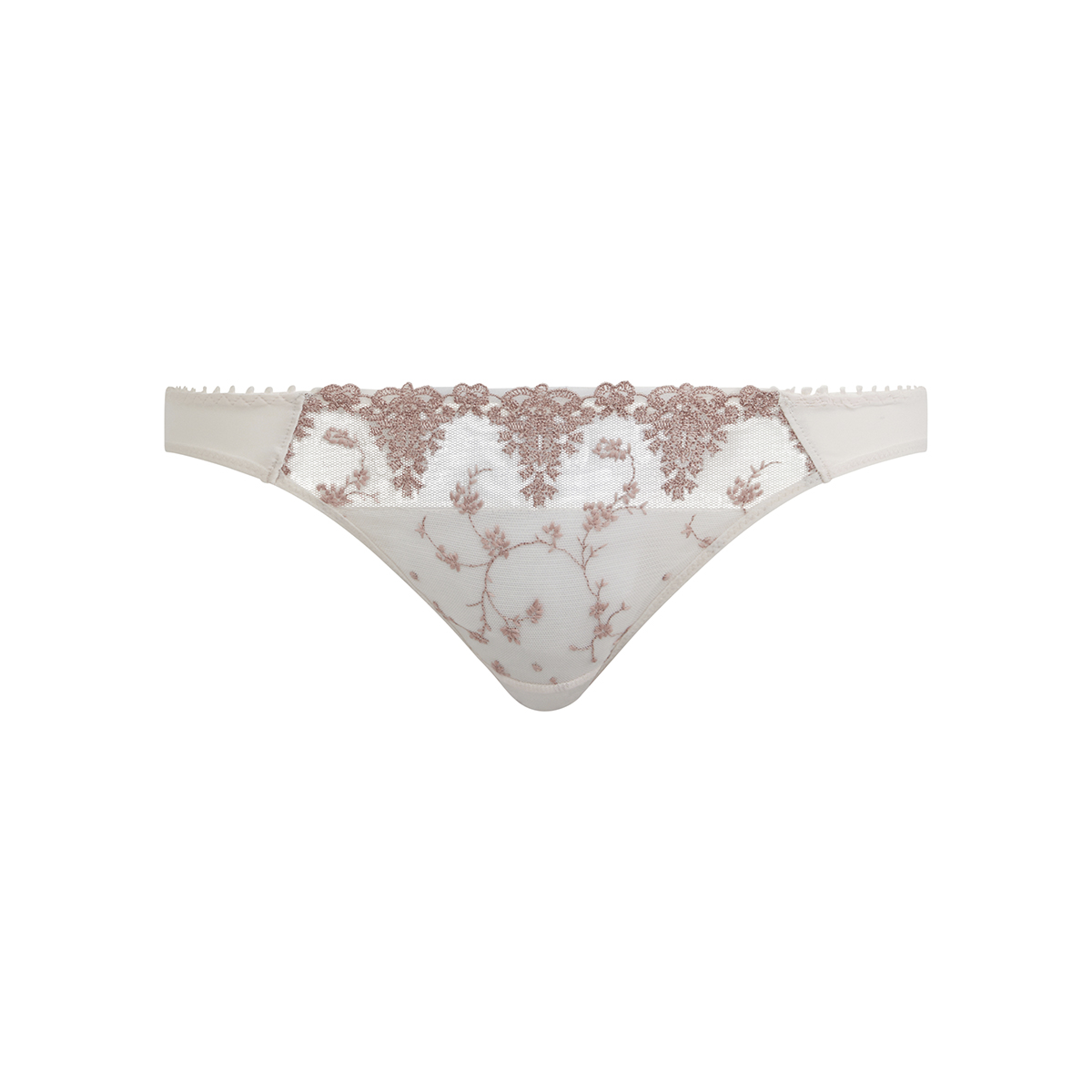 класична середньозанижена закрита форма трусиків; передня панель дубльована та виконана з тюлю з ніжною квітковою вишивкою на тлі та контрастною вишивкою біля пояса; задня панель із мікрофібри; бавовняна ластка.