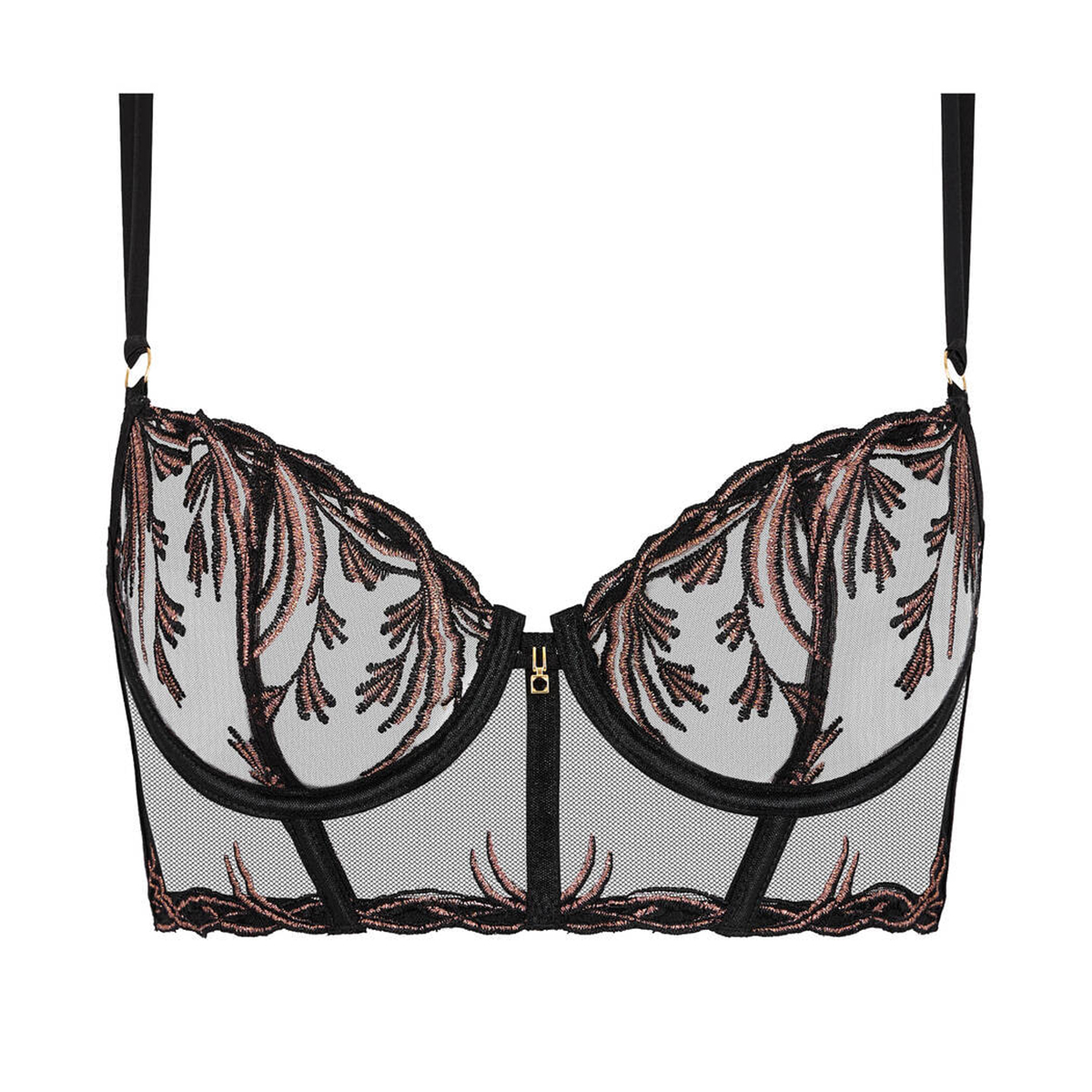 Элегантное бюстье на косточках с мягкими чашками, выполнено из сексуального прозрачного тюля, расшитого изящной вышивкой с золотой нитью. Между чашками сияет эксклюзивный позолоченный элемент. Широкая застёжка на задней панели и регулируемые фиксированные бретели обеспечивают комфорт и надёжную посадку.