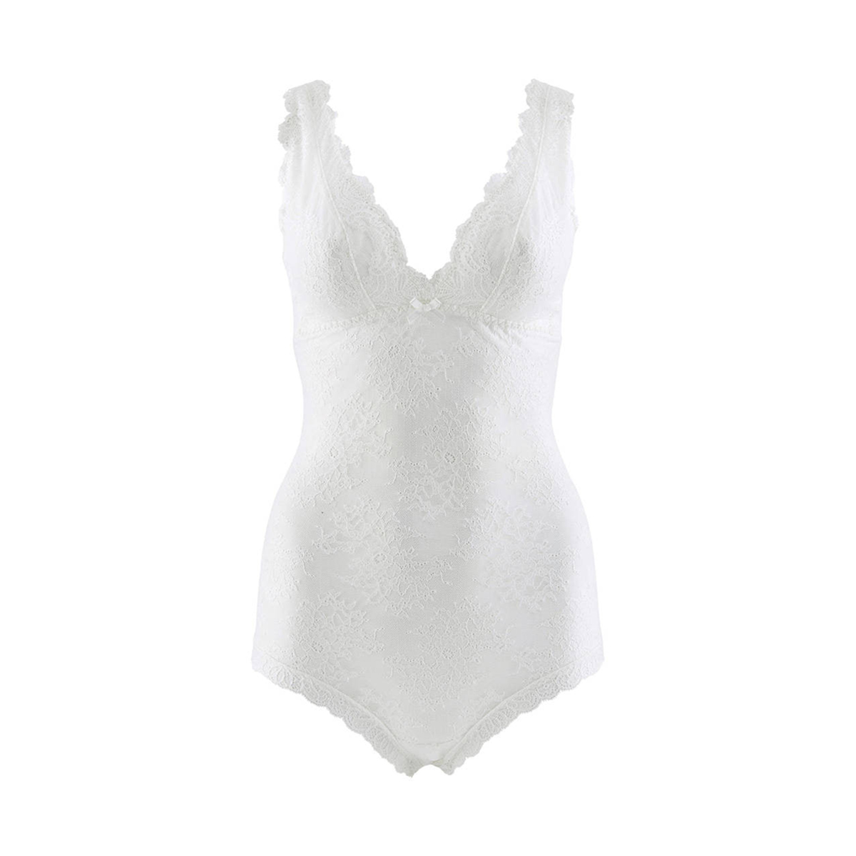 Боди с мягкой треугольной формой чашек без косточек. Полностью выполнен из кружева с цветочным орнаментом. Чашки с внутренней стороны дублированы тюлем для придания необходимой поддеркжи. Глубокое, V-образной формы, декольте дополнено декоративными зубчиками. Задняя панель - в форме классических трусов. Бретели - не регулируются. Застежка - на крючках между ног.