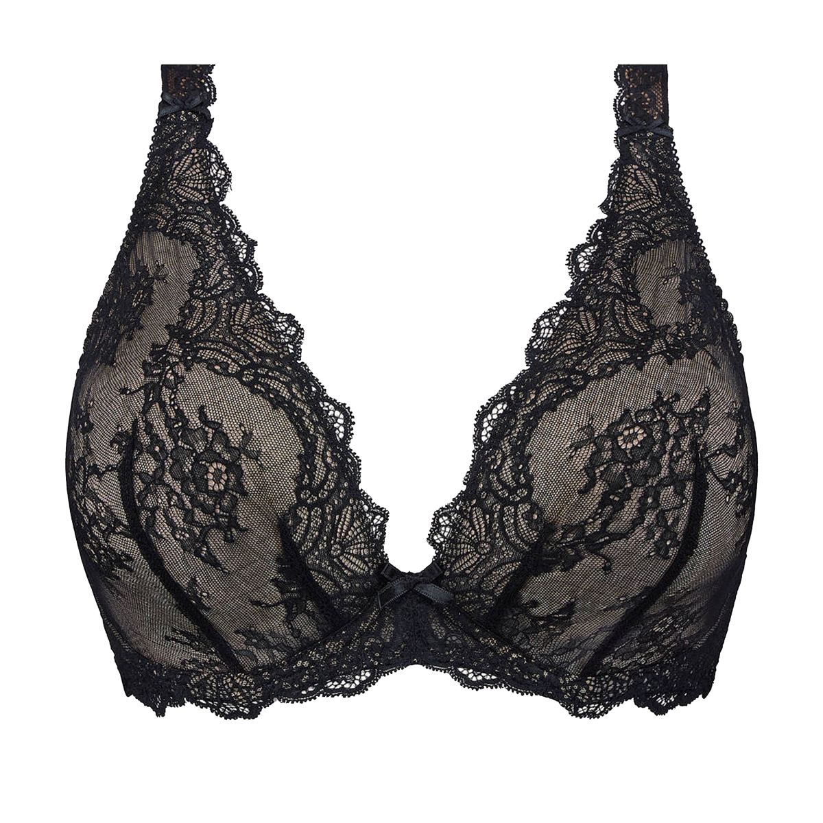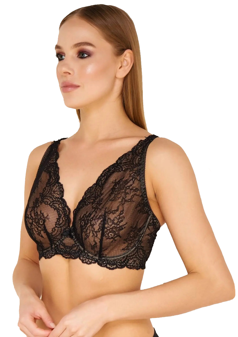 Бюстгальтер на косточках с мягкой треугольной формой чашек на подкладке, выполнен из эллегантного кружева с нежным цветочным орнаментом. Между чашек и у основания фиксированных тонких бретелей расположены деликатные атласные бантики, придающие образу изящества и мягкости. U-образная спинка и застежка на задней панели обеспечивает надежную посадку.