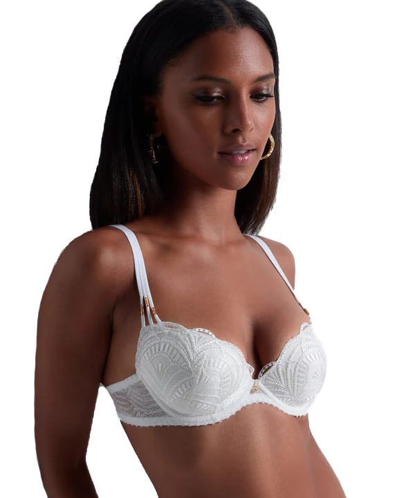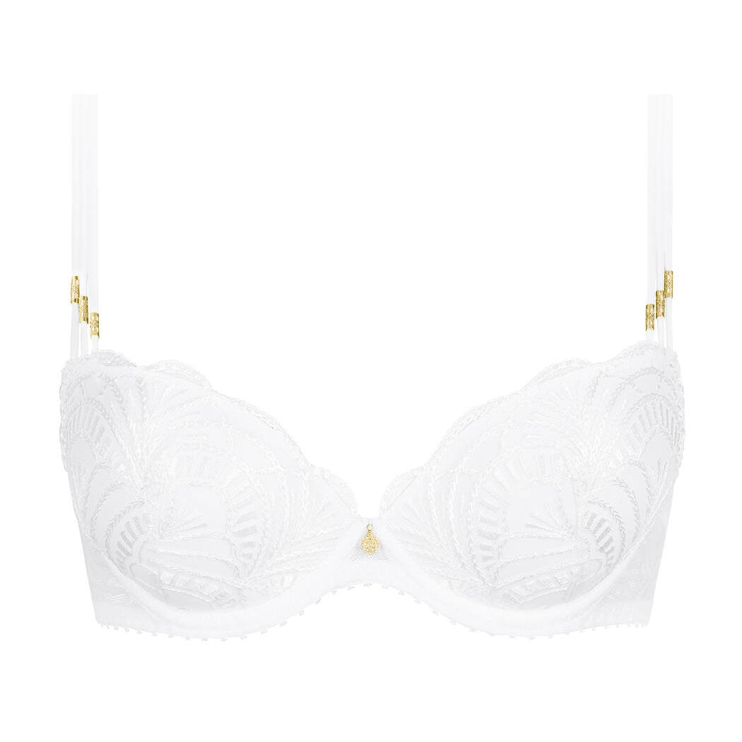 Бюстгальтер - пуш ап с уплотненной формой чашек с прослойкой из мусса для придания дополнительного объема. Чашки покрыты расшитым тюлем с минималистичным рисунком. Область декольте дополнена декоративной тесьмой. Центральная панель и основания бретелей декорированы золотыми украшениями. Боковые и задняя панели - из тюля с графичным рисунком. Регулирующиеся бретели.