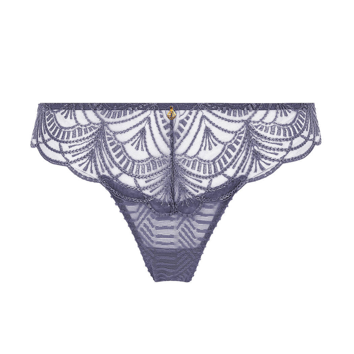 Трусы - бикини с заниженной посадкой. Передняя панель выполнена из эластичного тюля с графичным орнаментом в верхней части дополнена вставкой из расшитого тюля с минималистичным рисунком и золотым украшением; задняя - из расшитого тюля с минималистичным рисунком и дополнена вставкой из тюля с графичным орнаментом.