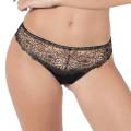 Трусы - бикини с заниженной посадкой. Передняя панель выполнена из непрозрачной микрофибры и дополнена деталью смокинга в виде атласной пуговки; боковые и задняя - из вышивки в стиле гипюр на паутинной основе из контрастного тюля.