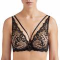 Бюстгальтер - балконет с мягкой, открытой формой чашек на косточках. Чашки выполнены из роскошного кружева с цветочным орнаментом. Центральная панель дополнена декоративной деталью с золотым кольцом; область декольте украшают декоративные зубчики. Регулирующиеся бретели, также, дополнены золотыми кольцами. Съемная декоративная деталь. Задняя часть бретелей - из трех частей, которые сливаются воедино при помощи золотых колец.