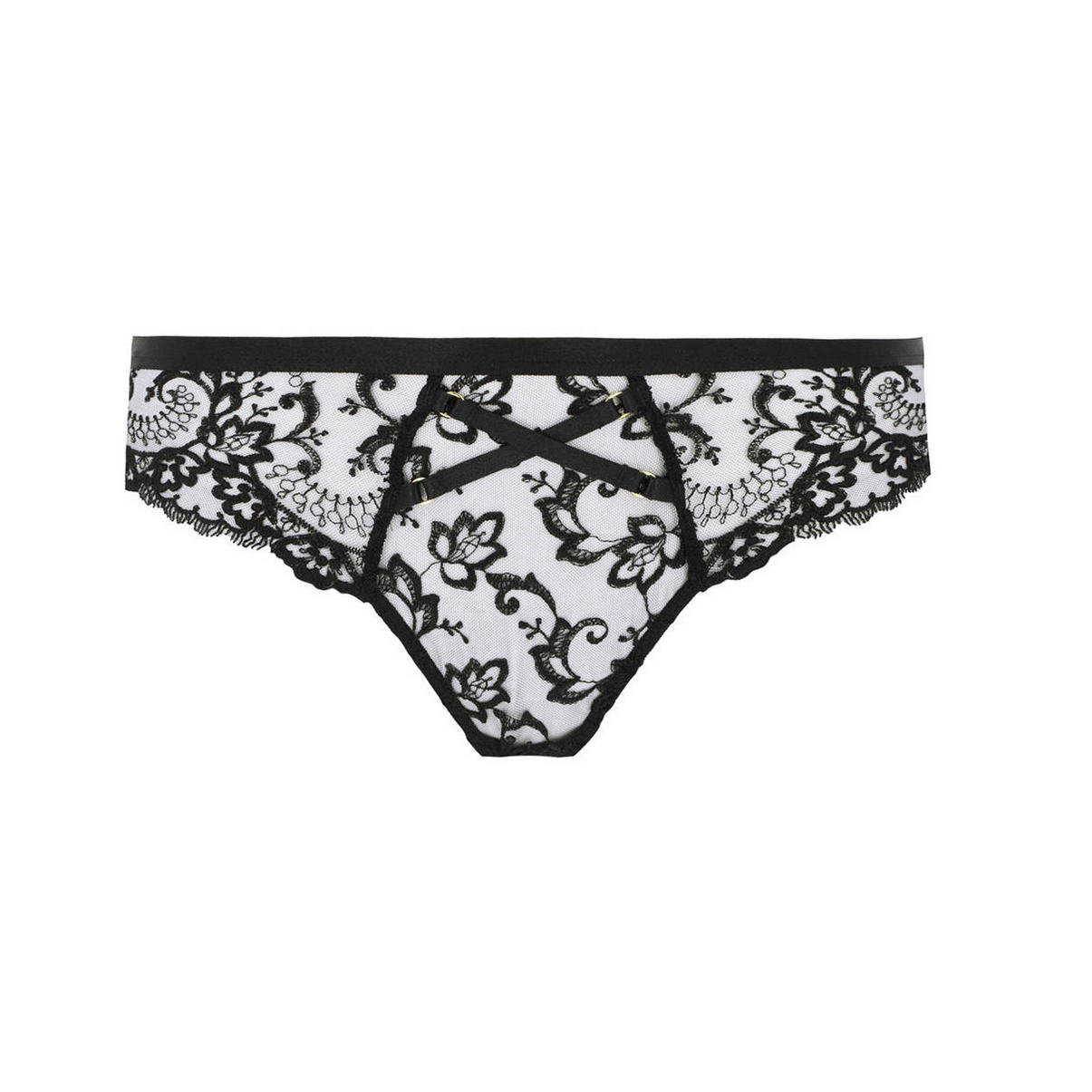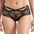Трусы-бикини со средне-заниженной посадкой. Полностью выполнены из изысканного кружева с цветочным орнаментом. Передняя панель декорирована элементами шнуровки и золотыми кольцами, задняя - геометричным переплетением полос.