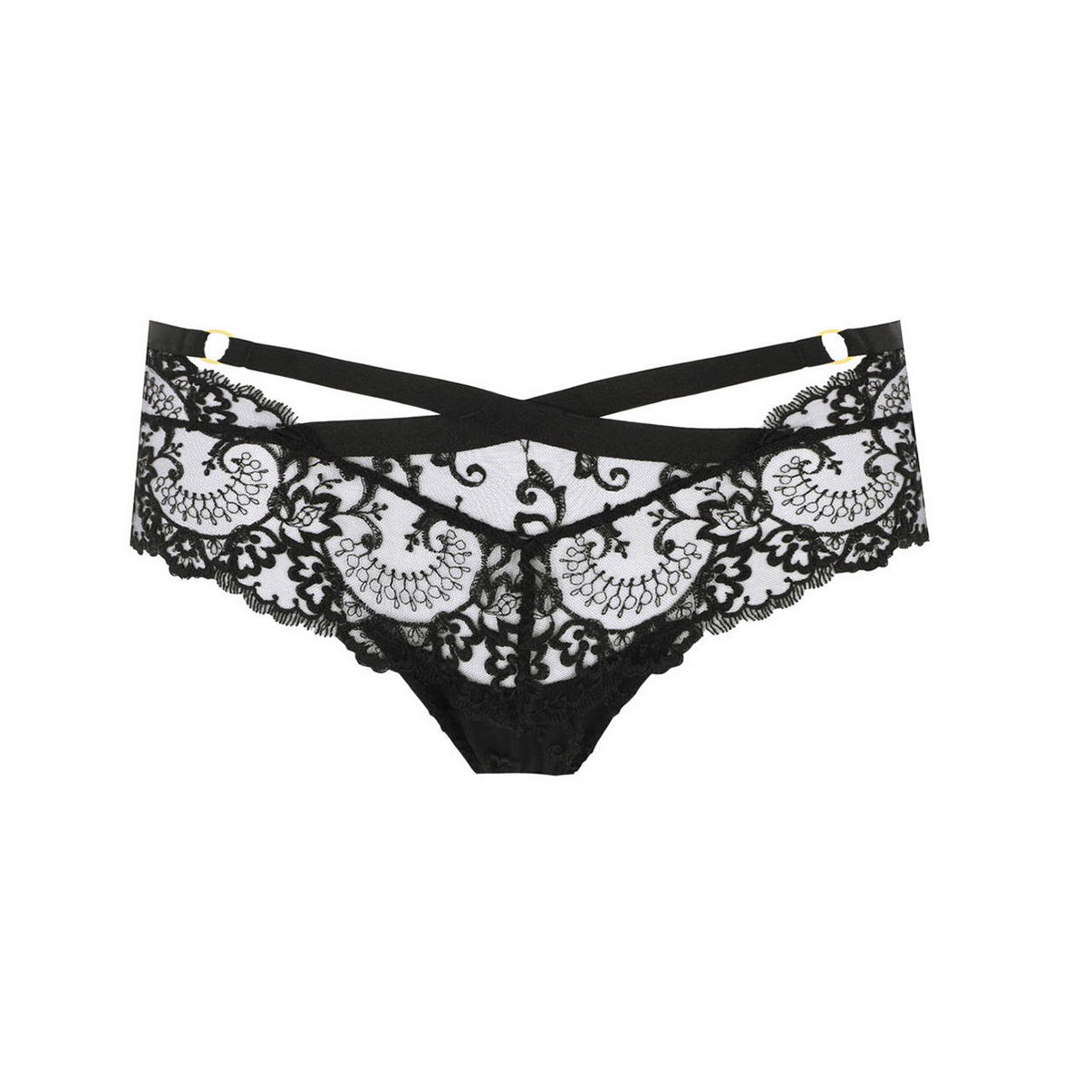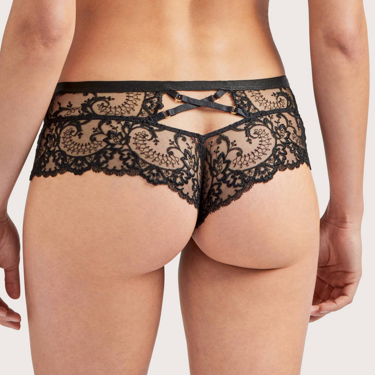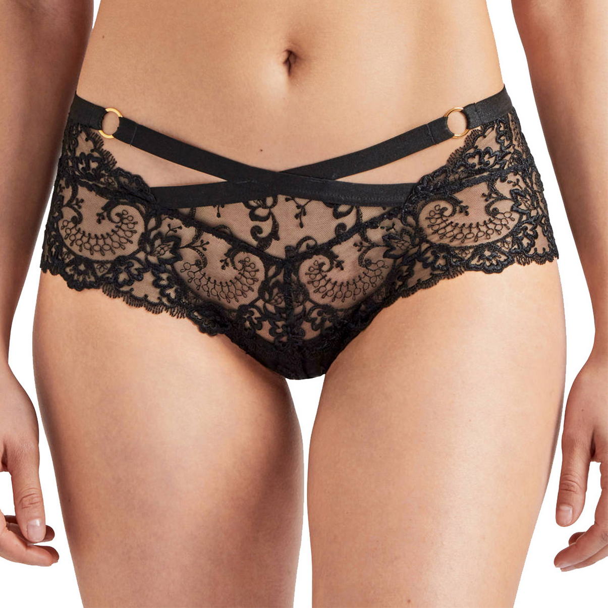 Трусы-боксеры со средне-заниженной посадкой. Полностью выполнены из изысканного кружева с цветочным орнаментом. Передняя панель декорирована элементами шнуровки и золотыми кольцами, задняя - геометричным переплетением полос.