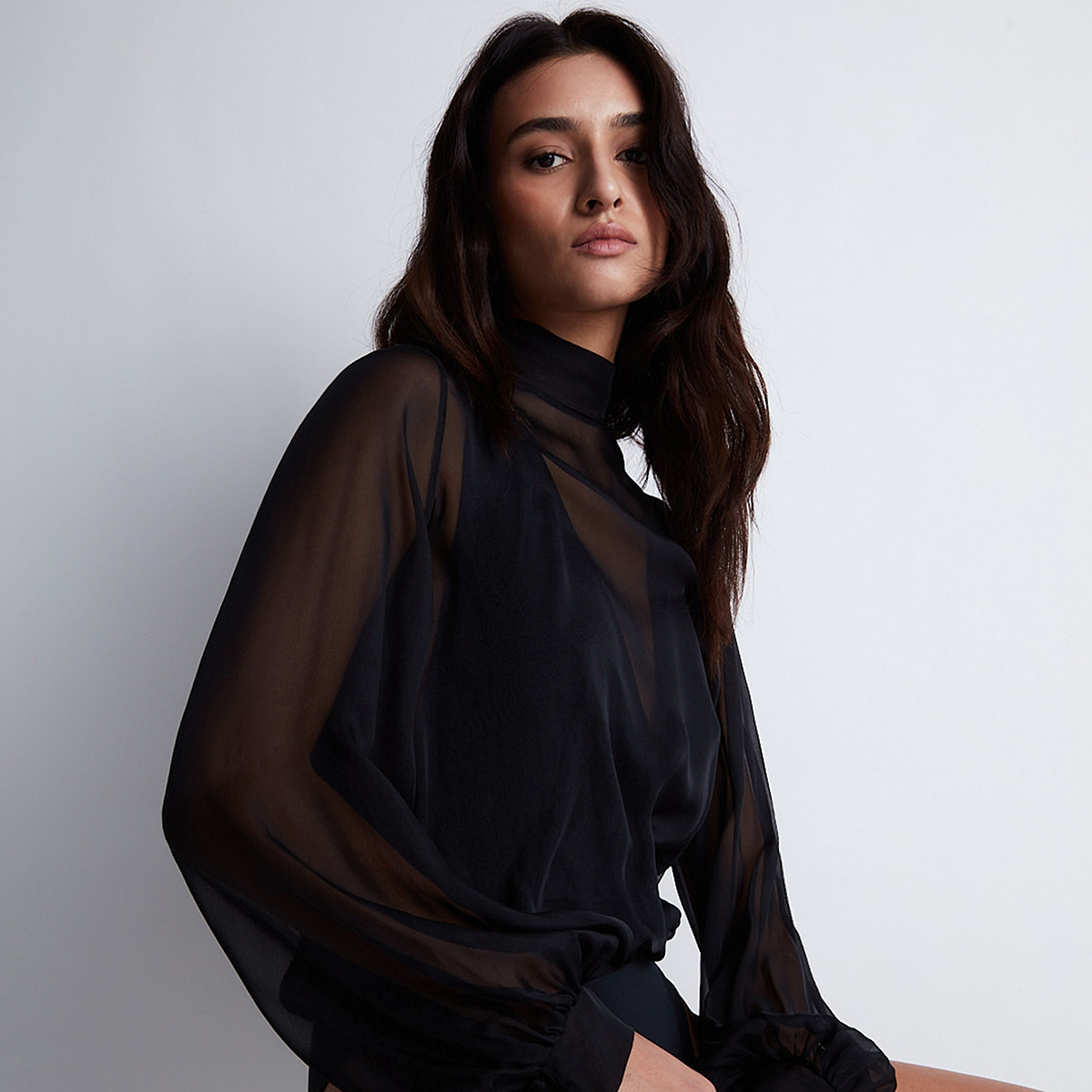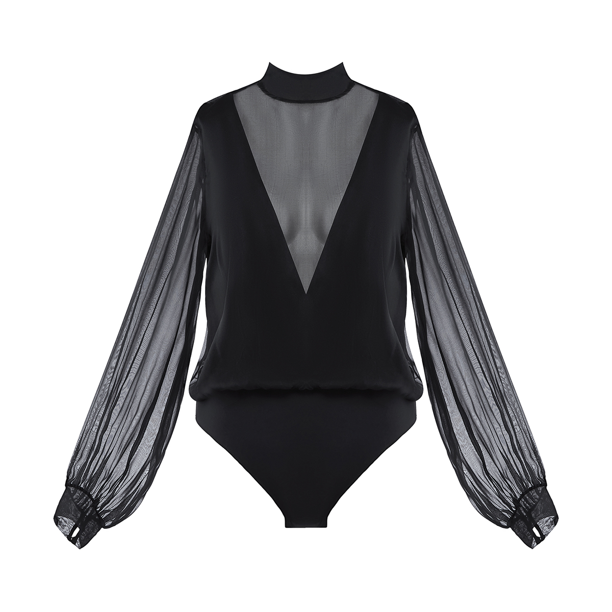 Боди из шелкового шифона. Глубокий V-образный вырез на передней и задней панелях декорирован вставками из тюля. Имеет высокую горловину и рукава выполнены также из тюля. Две застежки - между ног и на задней верхней панели.