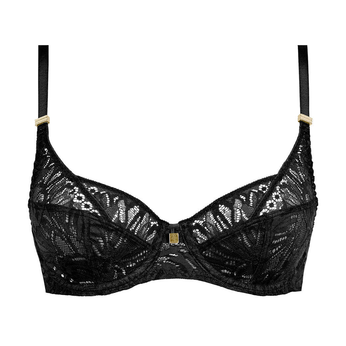 Классический бюстгальтер на косточках с полной чашкой и глубоким вырезом изящно подчёркивает форму груди, сочетая комфорт и соблазнительность. Выполнен из благородного итальянского жаккардового кружева с утончённым цветочным орнаментом. V-образная спинка обеспечивает надёжную поддержку. Между чашек и на бретелях сияют позолоченные украшения из замака, придавая модели блеск. Застёжка-крючок на задней панели завершает композицию.