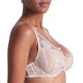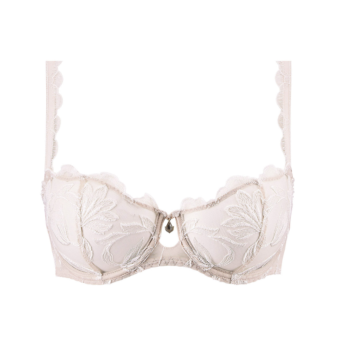 Бюстгальтер - балконет с мягкой открытой формой чашек на косточках. Чашки выполнены из расшитого швейцарской вышивкой тюля с цветочным орнаментом. На центральной панели - небольшое украшение. Декоративные регулирующиеся бретели. Боковые панели, выполненные из расшитого швейцарской вышивкой тюля с цветочным орнаментом, дополнены французским гипюром. Для больших размеров: чашки с внутренней стороны дублированы тюлем, балетная спинка.