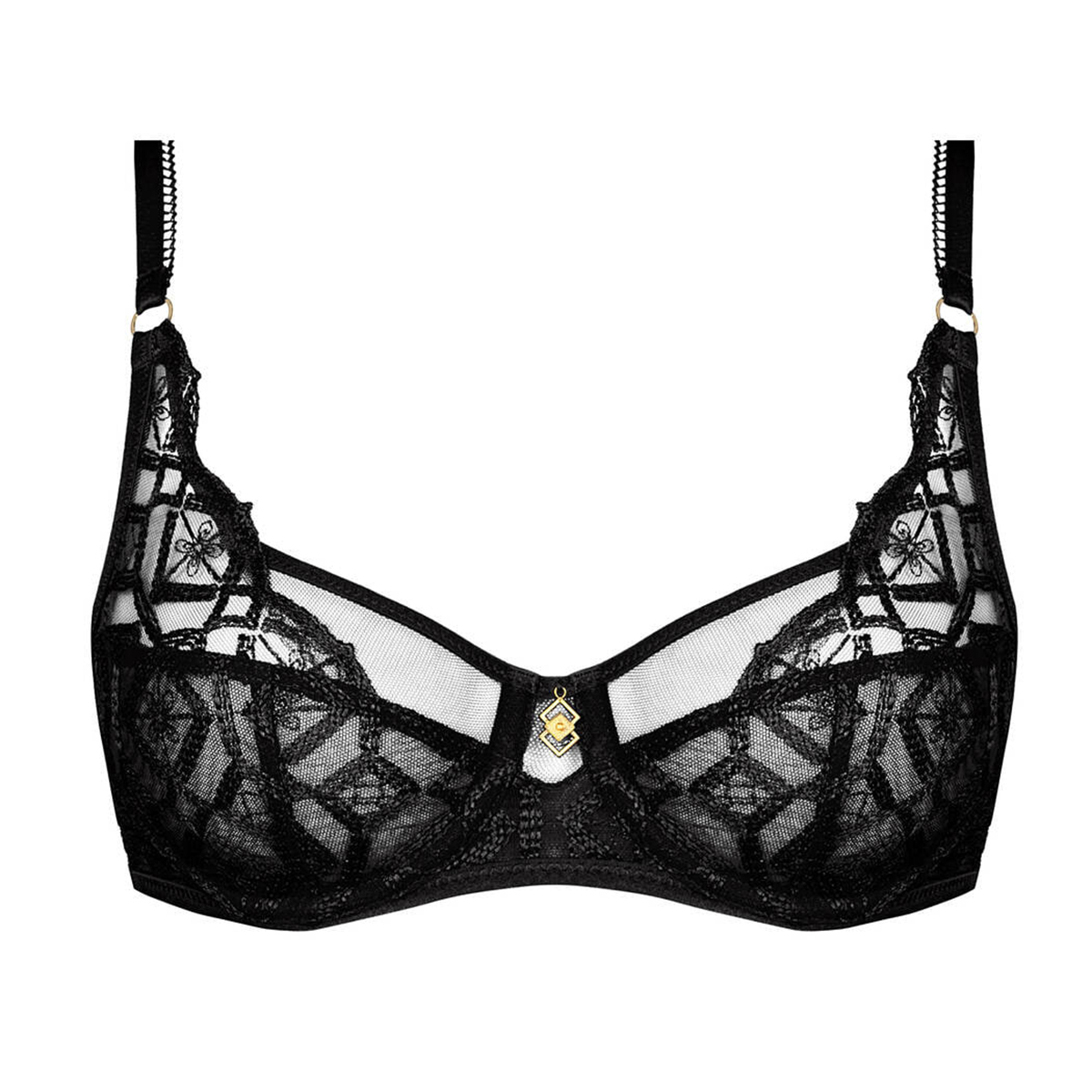Классический бюстгальтер на косточках с полной чашкой, выполнен из изысканного итальянского тюля, созданного из переработанных материалов, и украшен тонкой графической вышивкой. Между чашек сияет утонченное позолоченное украшение, придающее образу драгоценный акцент. Изящные регулируемые бретели и U-образная спинка обеспечивают комфорт и надежную поддержку, а аккуратная застёжка на задней панели завершает гармоничный силуэт.