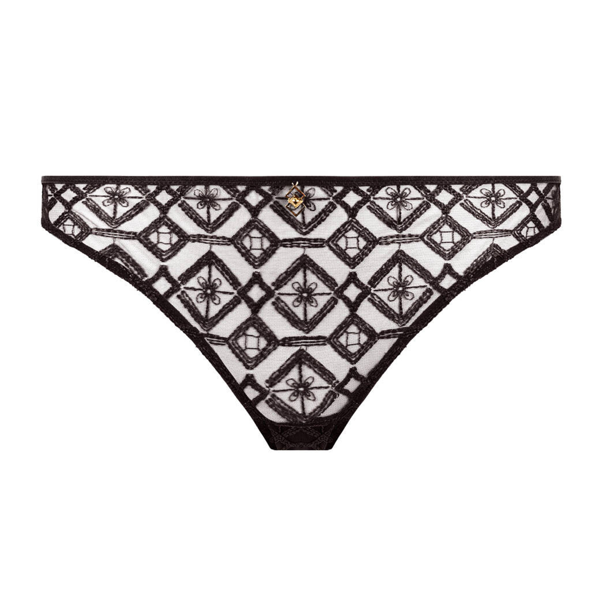 Классические трусы со слегка заниженной посадкой. Выполнены из прозрачного итальянского тюля, созданного из переработанных материалов. Передняя панель украшена утончённой графической вышивкой и изысканным позолоченным акцентом, придающим модели изящество и благородное сияние.