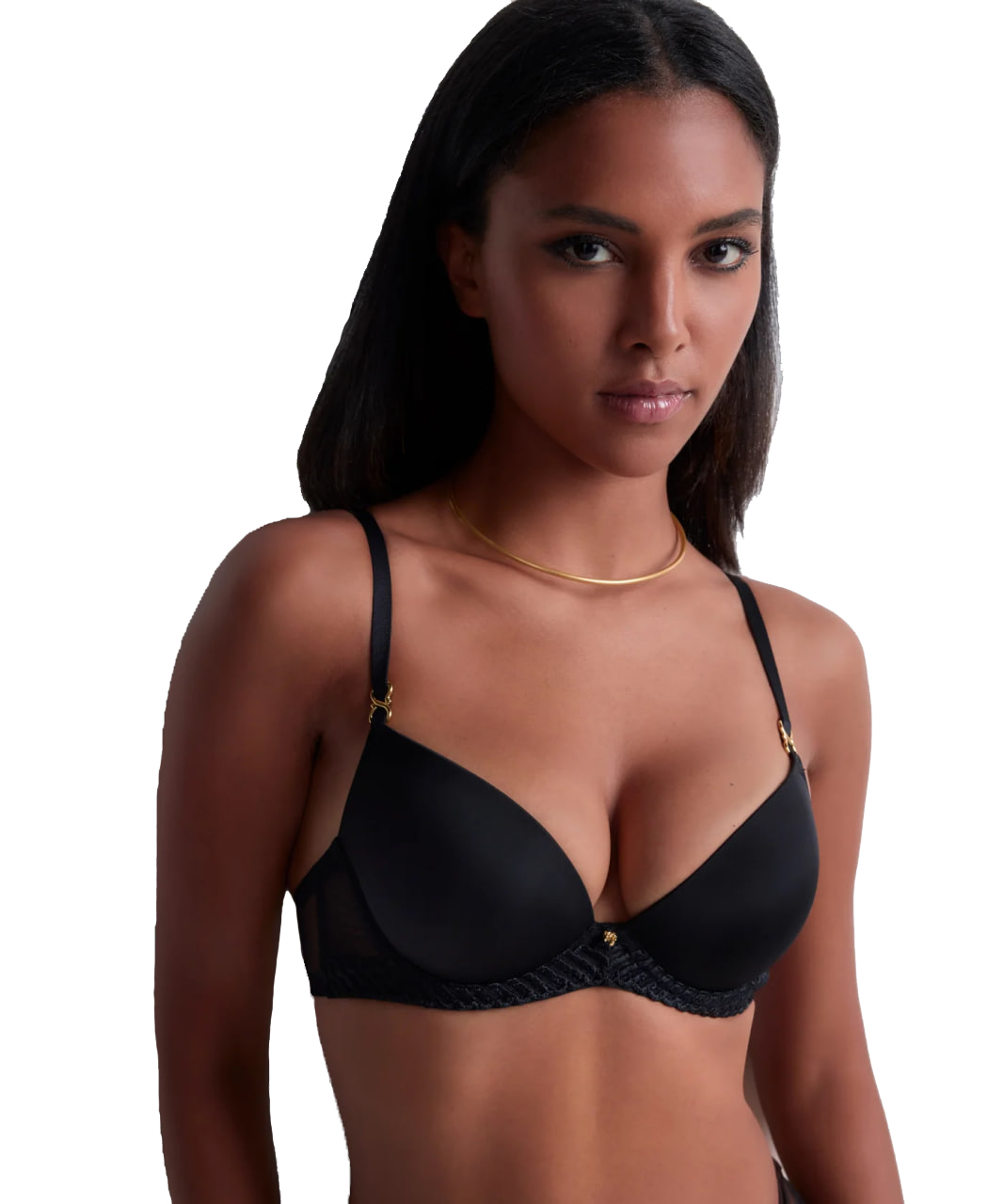 Бюстгальтер-пуш ап на косточках с уплотненными чашками и дополнительной подкладкой у основания, визуально увеличивает и центрирует грудь, создавая соблазнительный силуэт. Чашки выполнены из мягкой эластичной ткани, основа — из прозрачного переработанного тюля. Нижний край передней панели украшен изысканной атласной вышивкой, между чашек и у основания регулируемых бретелей расположены позолоченные украшения из замака. На задней панели предусмотрена застежка-крючок для надежной фиксации.
