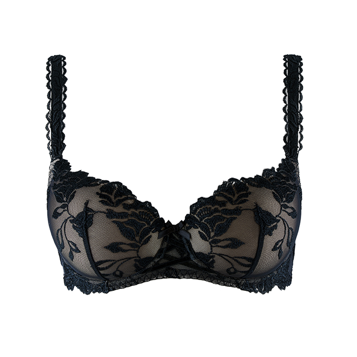 Бюстгальтер со слегка уплотненной мулированной формой чашек. На косточках. Гарантировано обеспечит необходимую поддержку и придаст Вашей груди еще более округлую форму. Чашки бюстгальтера покрыты расшитым цветочной вышивкой тюлем. Центральная панель декорирована шнуровкой. Регулирующиеся бретели.