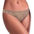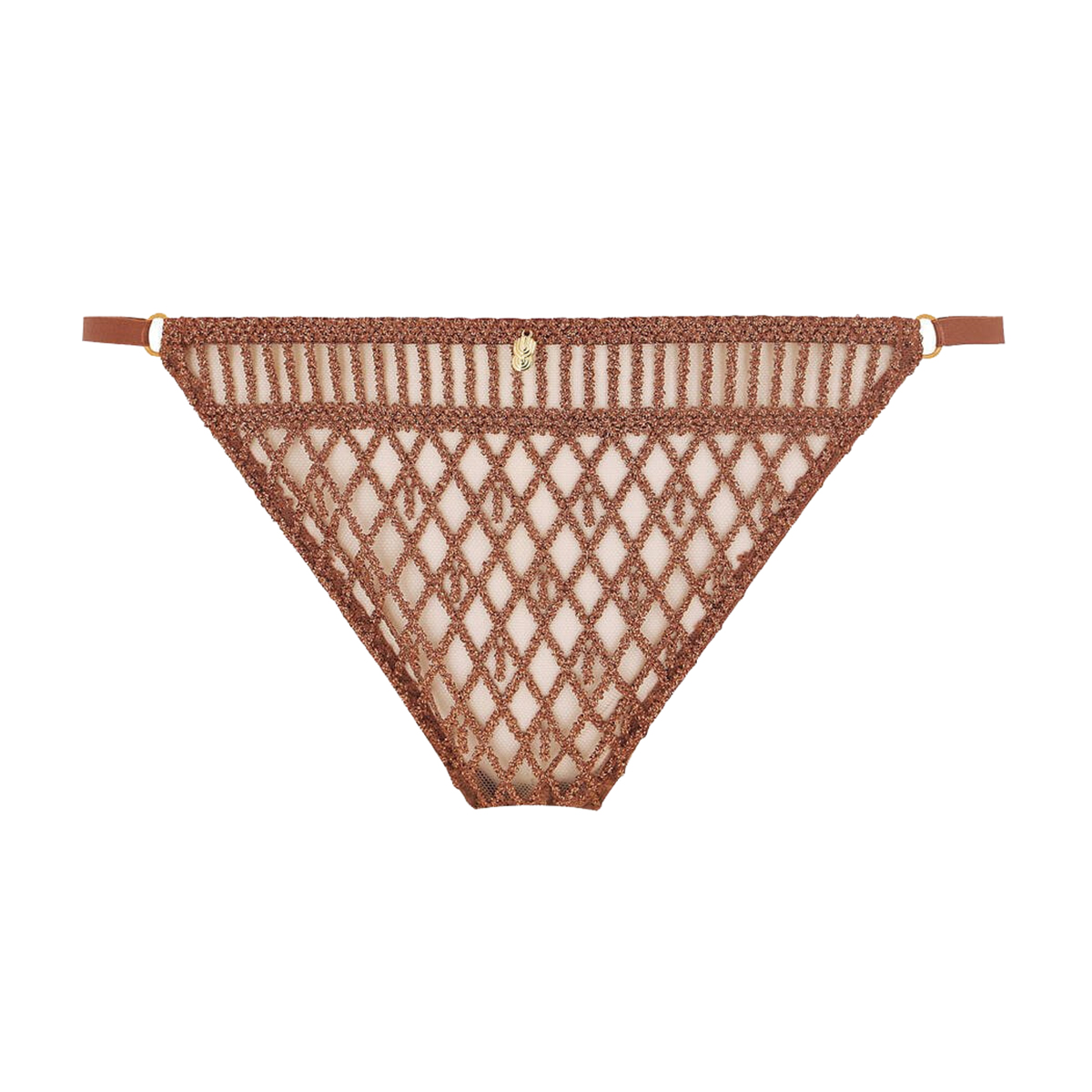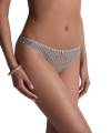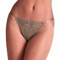 Трусы-бикини со средне-заниженной посадкой, выполнены из прозрачного тюля с блестящей люрексовой вышивкой. Боковые панели украшены эластичными двойными бретелями, придающими модели изысканный акцент. Передняя и задняя части декорированы позолоченными украшениями из замака, что подчеркивает эксклюзивный стиль изделия.