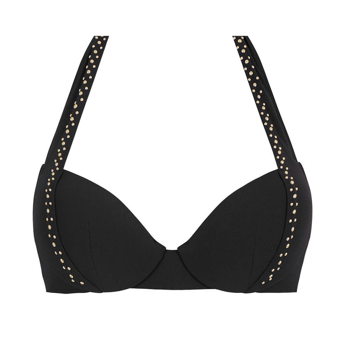 Бюстгальтер-пуш ап на косточках, чашки с дополнительной подкладкой для эффектного, выразительного декольте. Выполнен из переработанной эластичной гладкой ткани, мягко облегающей силуэт и подчёркивающей линии тела. Широкие бретели завязываются на шее, создавая соблазнительный акцент, а надёжная застёжка на спинке обеспечивает комфортную фиксацию. Чашки и бретели декорированы позолоченными стразами, придающими модели утончённое, мерцающее сияние.