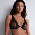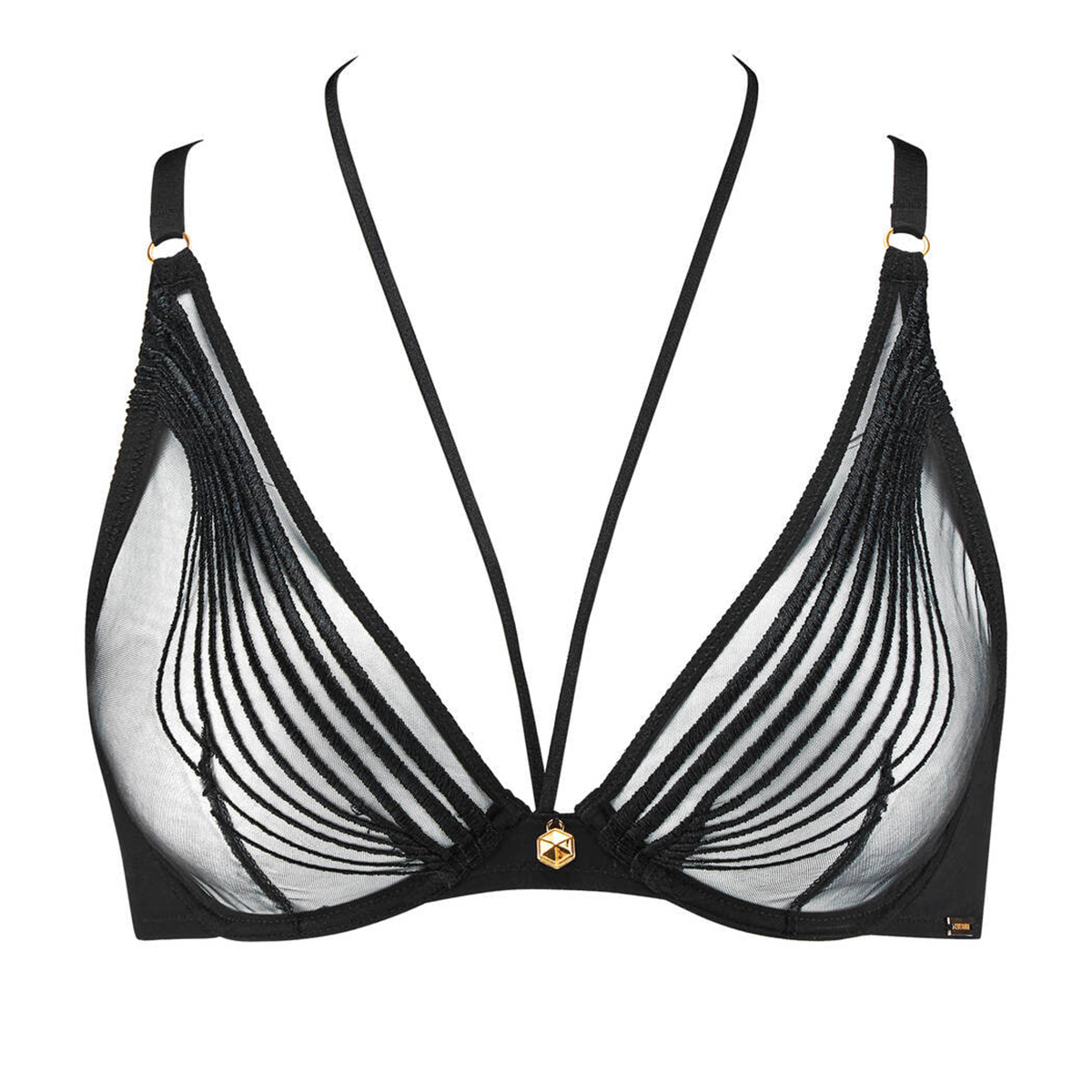 Бюстгальтер на косточках с мягкими треугольными чашками, выполнен из соблазнительного прозрачного тюля, расшитого элегантной графической вышивкой. Между чашками расположено уникальное позолоченное украшение из замака, придающее модели выразительный акцент. Эластичные фиксированные регулируемые бретели и застёжка на задней панели обеспечивают надёжную и комфортную посадку. Образ дополняет декоративный шнурок, закреплённый между чашками и изящно фиксирующийся на шее.