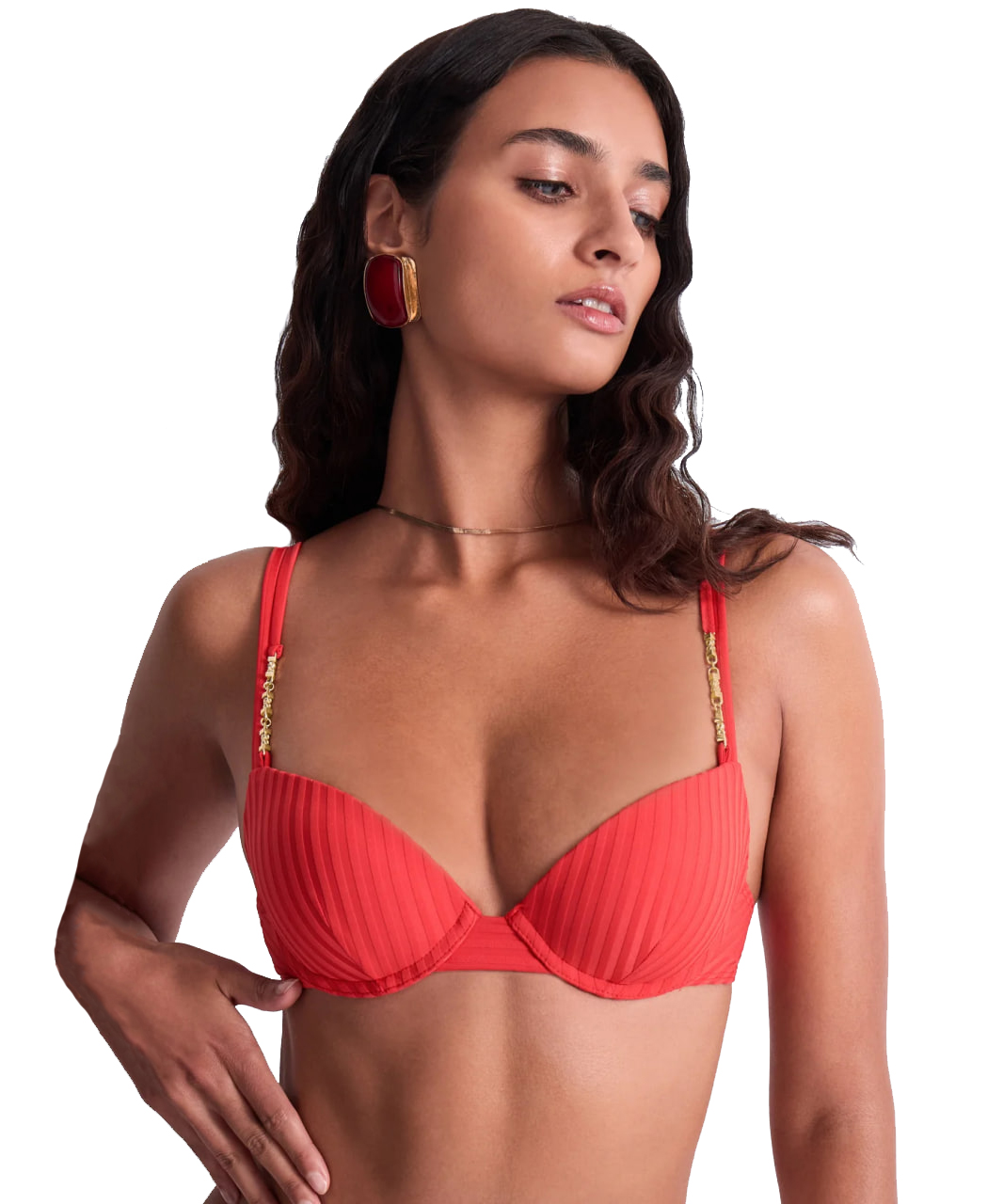 Бюстгальтер пуш-ап на косточках с подушечками у основания чашек визуально увеличивает грудь и придаёт ей соблазнительную округлую форму. Модель с выразительной ребристой текстурой выполнена из приятного эластичного материала, мягко облегающего силуэт. Двойные регулируемые фиксированные бретели у основания украшены изящной золотой цепочкой, добавляющей утончённый акцент. На спинке предусмотрена застёжка для надёжной и комфортной посадки.