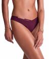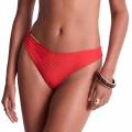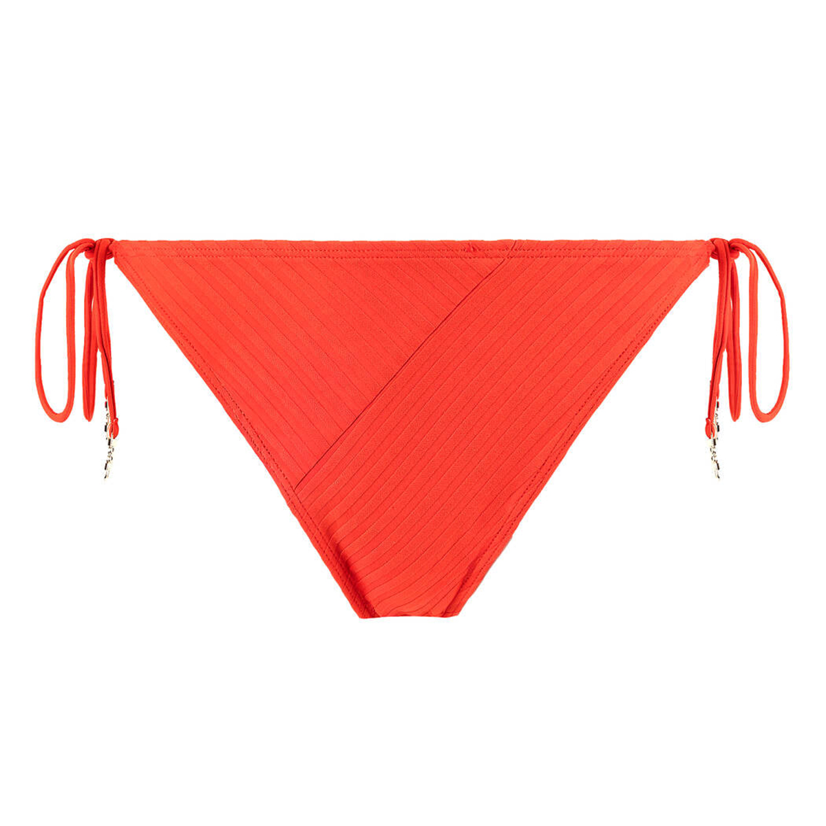 Трусы-бикини со средне-заниженной посадкой, выполнены из эластичной ткани с рельефной ребристой текстурой, подчёркивающей линии тела. Завязки на боковых панелях позволяют легко регулировать посадку и добавляют модели лёгкую игривость. На задней панели расположен лаконичный золотой элемент из цинкового сплава — стильный акцент с современным характером.