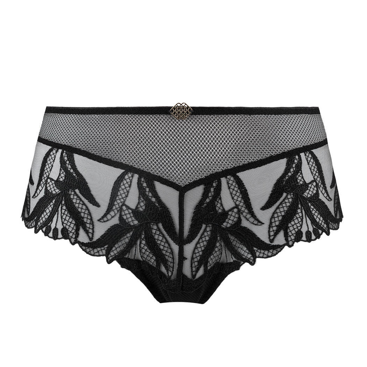 Трусы-боксеры со слегка завышенной посадкой, выполнены из прозрачного тюля с изысканной цветочной вышивкой и тонкой мелкой сетки. Центральную панель украшает эксклюзивный позолоченный элемент. Задняя панель дополнена аккуратным вырезом и декоративным позолоченным кольцом, создающим утончённый акцент.
