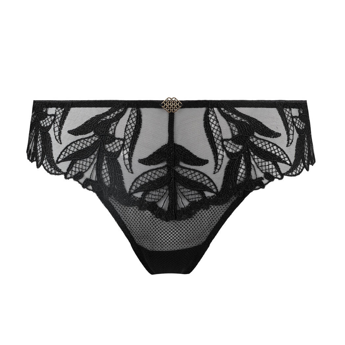 Классические трусы со средне-заниженной посадкой. Передняя панель выполнена из прозрачного тюля с изысканной цветочной вышивкой, задняя — из мягкой нежной микрофибры. Центральную панель украшает эксклюзивный позолоченный элемент, добавляющий утончённый акцент.